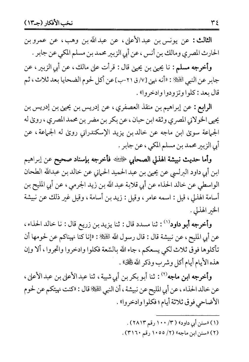 وأما حديث نبيشة الهذلي الصحابي -رضي الله عنه- فأخرجه بإسناد صحيح عن إبراهيم ابن أبي داود البرلسي عن يحيى بن عبد الحميد الحماني عن خالد بن عبد الله الطحان الواسطي عن خالد الحذاء عن أبي قلابة عبد الله بن زيد الجرمي، عن أبي المليح بن أسامة الهذلي، قيل: اسمه عامر، وقيل: زيد بن أسامة، وقيل غير ذلك عن نبيشة الخير الهذلي.