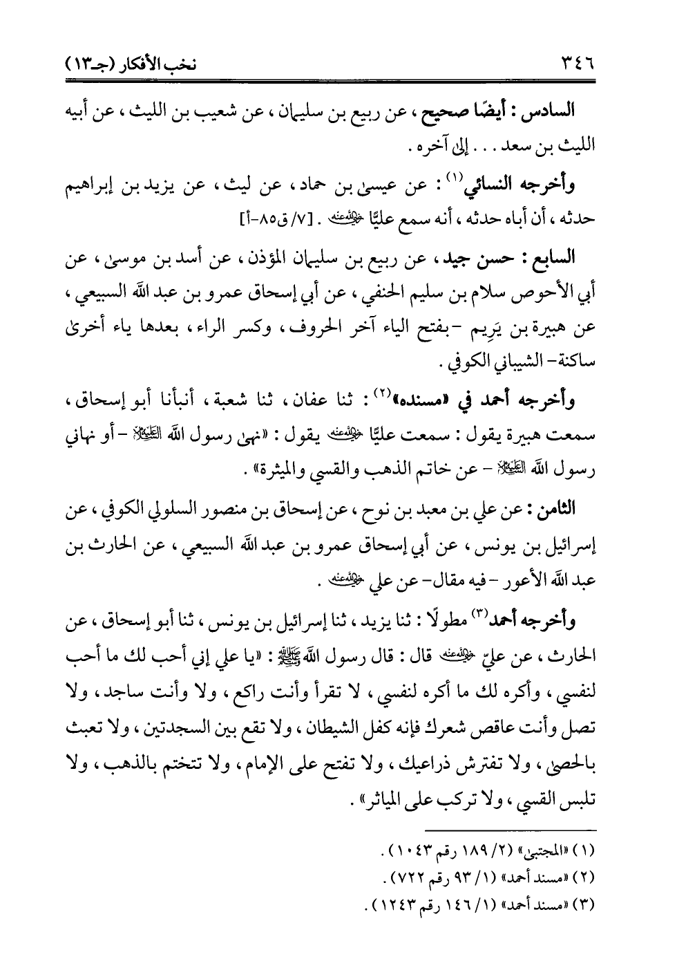 وأخرجه أحمد في "مسنده" (¬2): ثنا عفان، ثنا شعبة، أنبأنا أبو إسحاق، سمعت هبيرة يقول: سمعت عليًّا - رضي الله عنه - يقول: "نهى رسول الله -عليه السلام- أو نهاني رسول الله -عليه السلام- عن خاتم الذهب والقسي والميثرة".