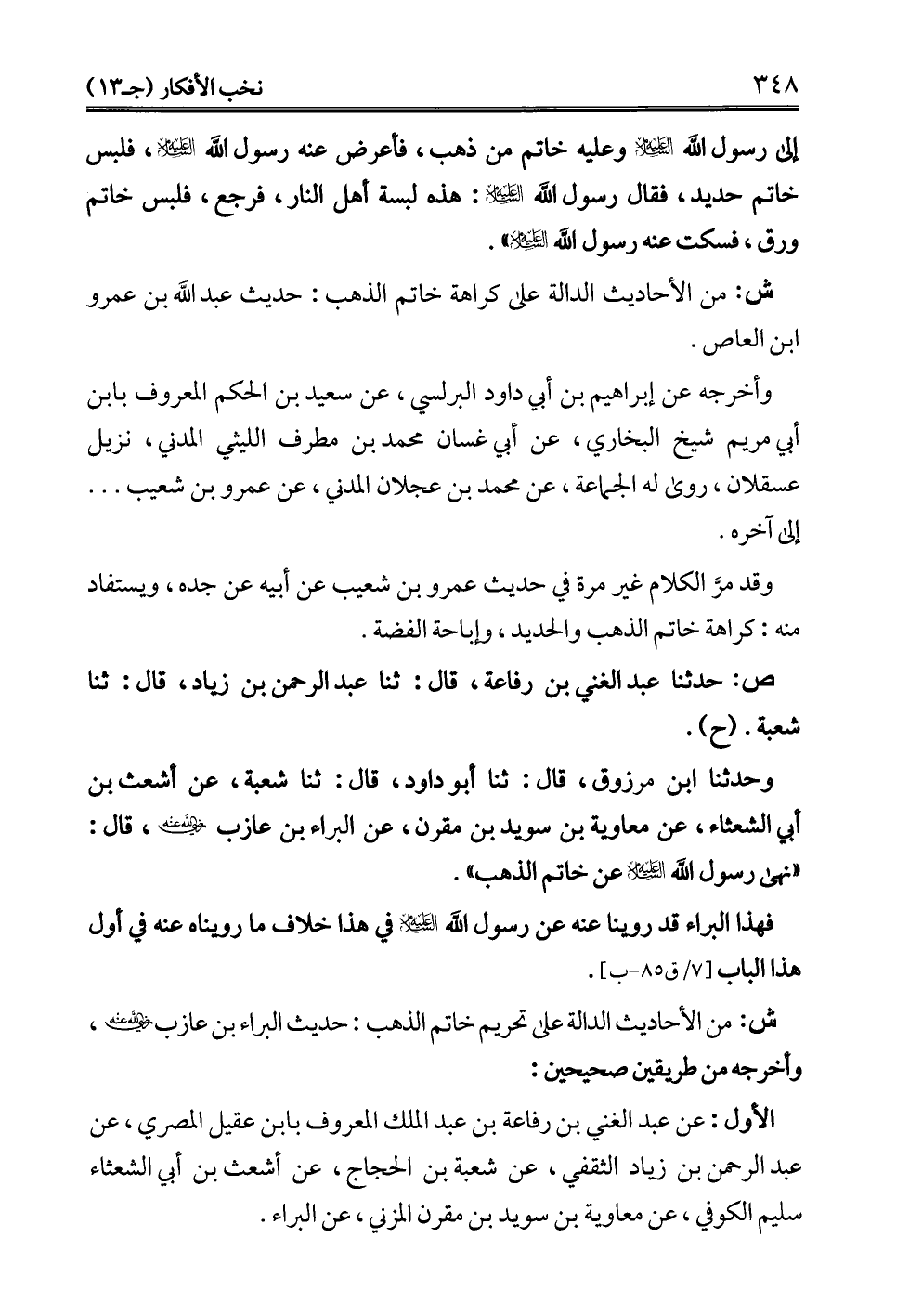 ش: من الأحاديث الدالة على تحريم خاتم الذهب: حديث البراء بن عازب - رضي الله عنه -، وأخرجه من طريقين صحيحين: