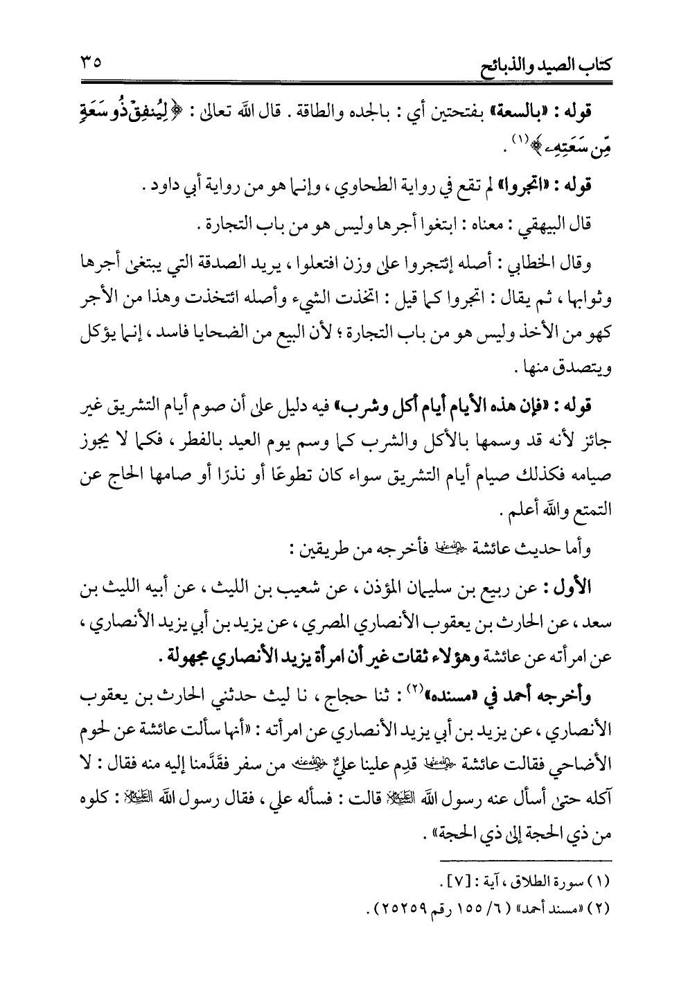 وأخرجه أحمد في "مسنده" (¬2): ثنا حجاج، نا ليث حدثني الحارث بن يعقوب الأنصاري، عن يزيد بن أبي يزيد الأنصاري عن امرأته: "أنها سألت عائشة عن لحوم الأضاحي فقالت عائشة -رضي الله عنها- قدِم علينا عليٌّ -رضي الله عنه- من سفر فقَدَّمنا إليه منه فقال: لا آكله حتى أسأل عنه رسول الله -عليه السلام- قالت: فسأله علي، فقال رسول الله -عليه السلام-: كلوه من ذي الحجة إلى ذي الحجة".