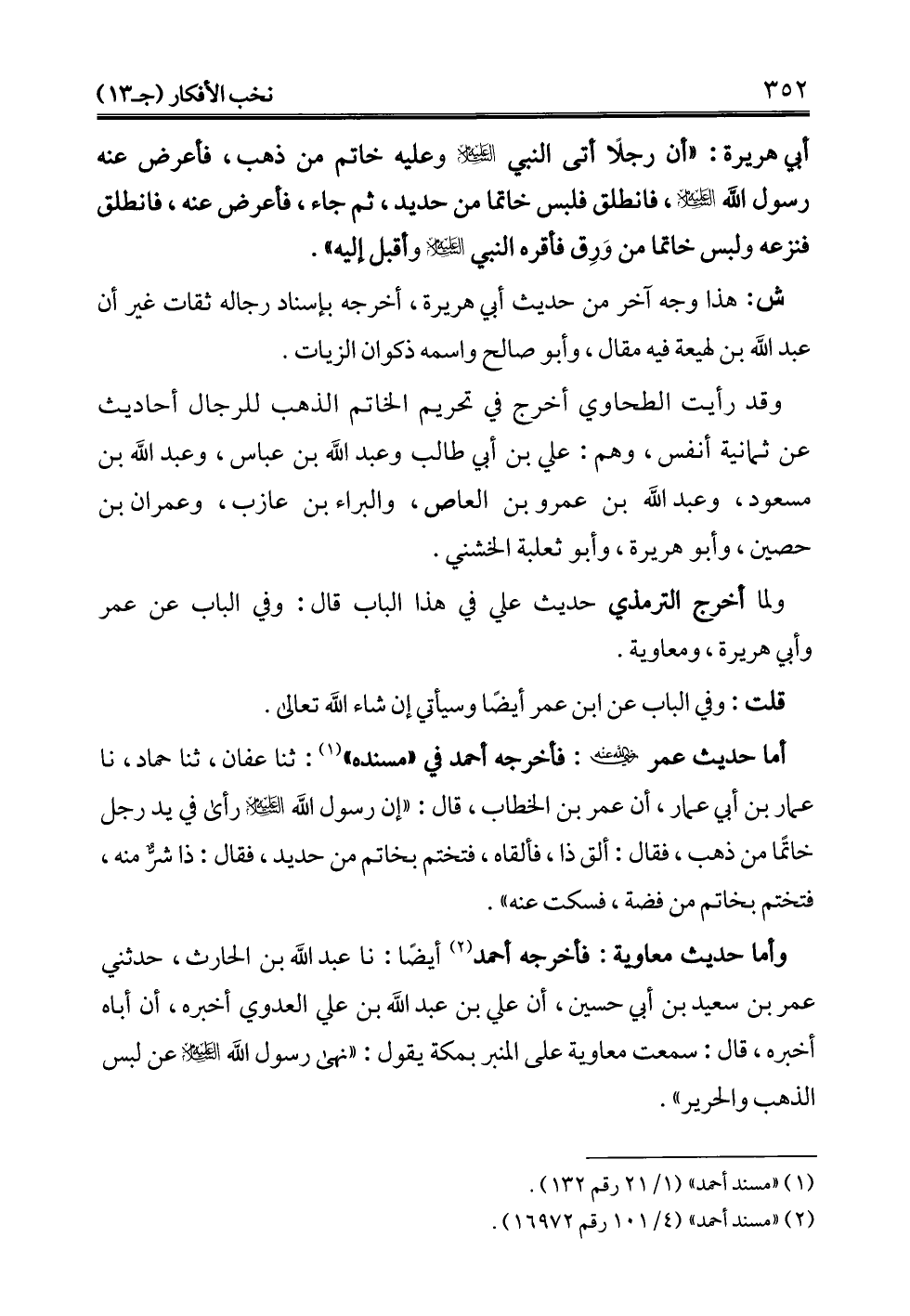 وقد رأيت الطحاوي أخرج في تحريم الخاتم الذهب للرجال أحاديث عن ثمانية أنفس، وهم: علي بن أبي طالب وعبد الله بن عباس، وعبد الله بن مسعود، وعبد الله بن عمرو بن العاص، والبراء بن عازب، وعمران بن حصين، وأبو هريرة، وأبو ثعلبة الخشني.