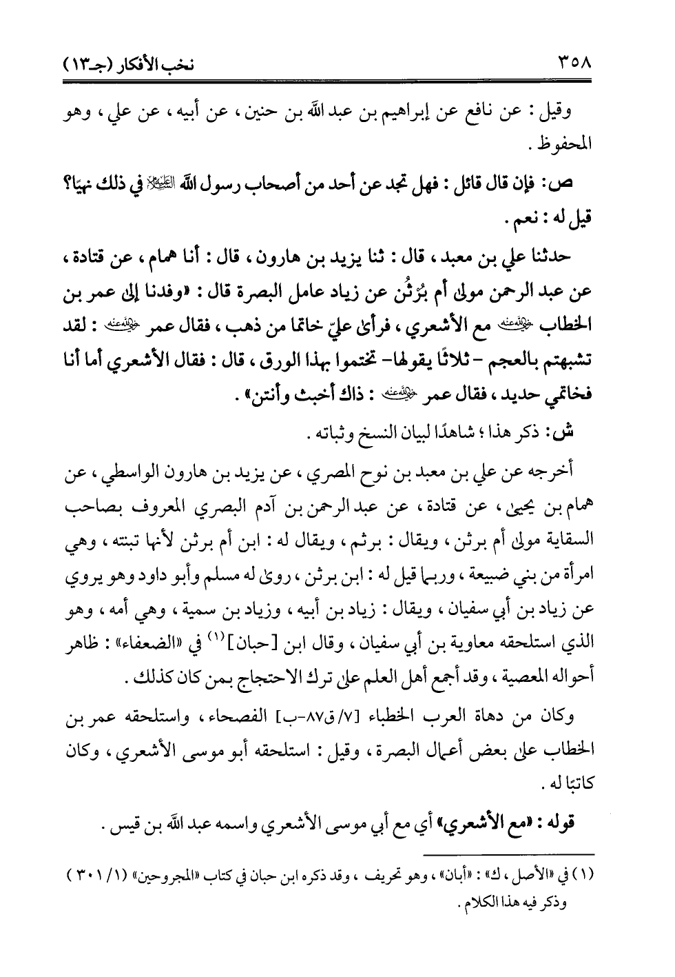 حدثنا علي بن معبد، قال: ثنا يزيد بن هارون، قال: أنا همام، عن قتادة، عن عبد الرحمن مولى أم بُرثُن عن زياد عامل البصرة قال: "وفدنا إلى عمر بن الخطاب - رضي الله عنه - مع الأشعري، فرأى عليّ خاتما من ذهب، فقال عمر - رضي الله عنه -: لقد تشبهتم بالعجم -ثلاثًا يقولها- تختموا بهذا الورق، قال: فقال الأشعري أما أنا فخاتمي حديد، فقال عمر - رضي الله عنه -: ذاك أخبث وأنتن".