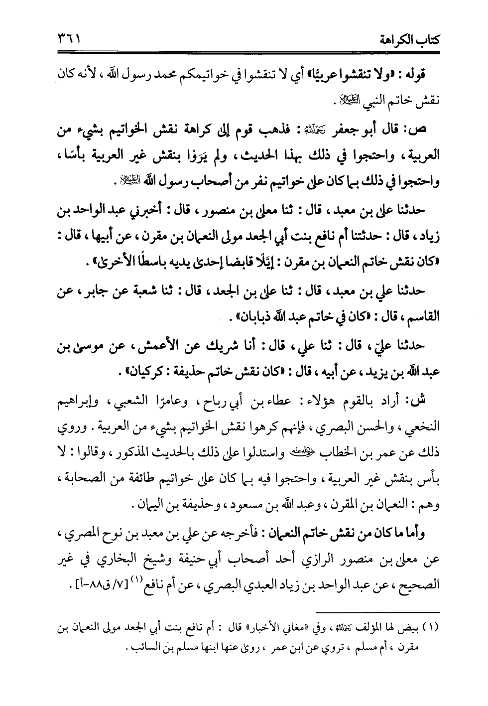 وأما ما كان من نقش خاتم النعمان: فأخرجه عن علي بن معبد بن نوح المصري، عن معلى بن منصور الرازي أحد أصحاب أبي حنيفة وشيخ البخاري في غير الصحيح، عن عبد الواحد بن زياد العبدي البصري، عن أم نافع (¬1).