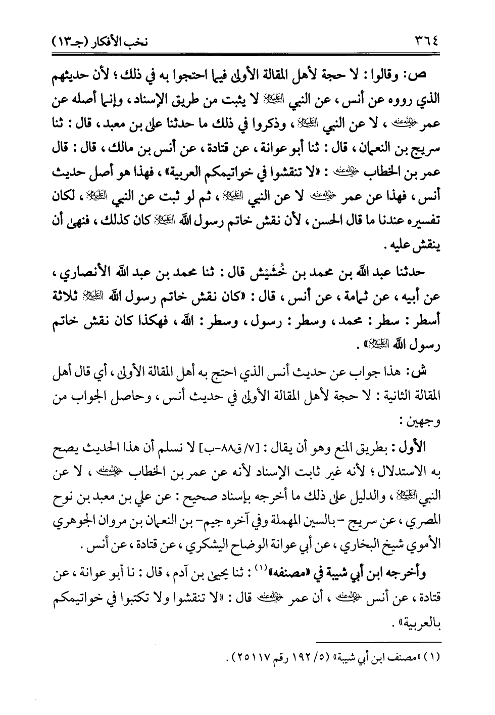 ص: وقالوا: لا حجة لأهل المقالة الأولى فيما احتجوا به في ذلك؛ لأن حديثهم الذي رووه عن أنس، عن النبي -عليه السلام- لا يثبت من طريق الإسناد، وإنما أصله عن عمر - رضي الله عنه -، لا عن النبي -عليه السلام-، وذكروا في ذلك ما حدثنا على بن معبد، قال: ثنا سريج بن النعمان، قال: ثنا أبو عوانة، عن قتادة، عن أنس بن مالك، قال: قال عمر بن الخطاب - رضي الله عنه -: "لا تنقشوا في خواتيمكم العربية"، فهذا هو أصل حديث أنس، فهذا عن عمر - رضي الله عنه - لا عن النبي -عليه السلام-، ثم لو ثبت عن النبي -عليه السلام-، لكان تفسيره عندنا ما قال الحسن، لأن نقش خاتم رسول الله -عليه السلام- كان كذلك، فنهى أن ينقش عليه.