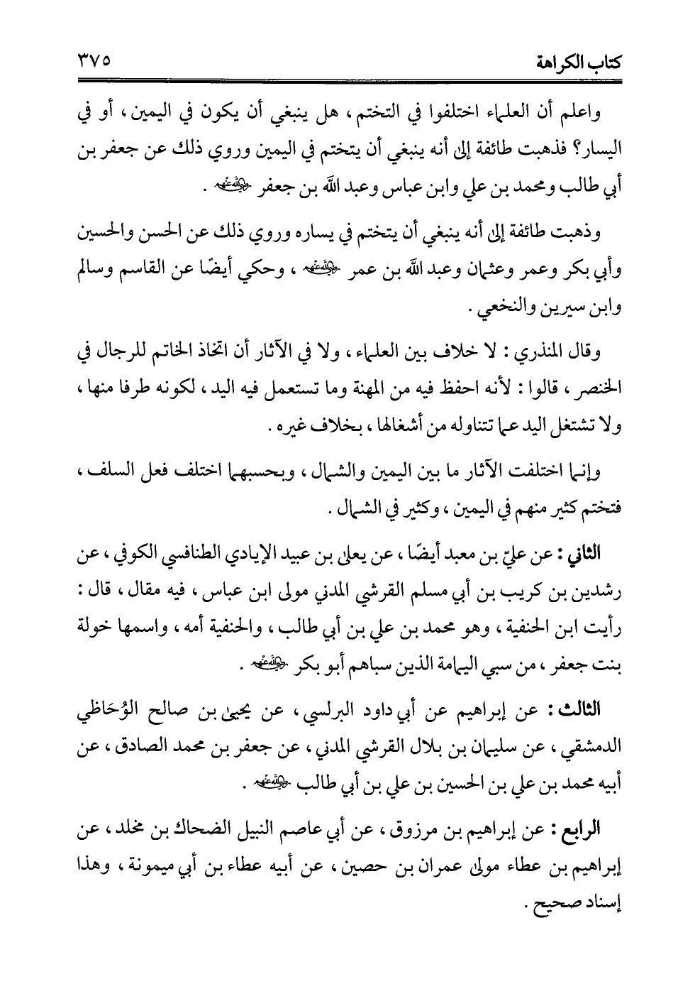 واعلم أن العلماء اختلفوا في التختم، هل ينبغي أن يكون في اليمين، أو في اليسار؟ فذهبت طائفة إلى أنه ينبغي أن يتختم في اليمين وروي ذلك عن جعفر بن أبي طالب ومحمد بن علي وابن عباس وعبد الله بن جعفر - رضي الله عنهم -.