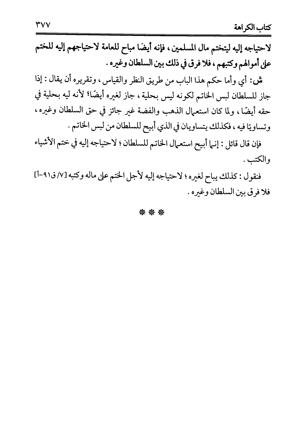 لاحتياجه إليه ليتختم مال المسلمين، فإنه أيضًا مباح للعامة لاحتياجهم إليه للختم على أموالهم وكتبهم، فلا فرق في ذلك بين السلطان وغيره.