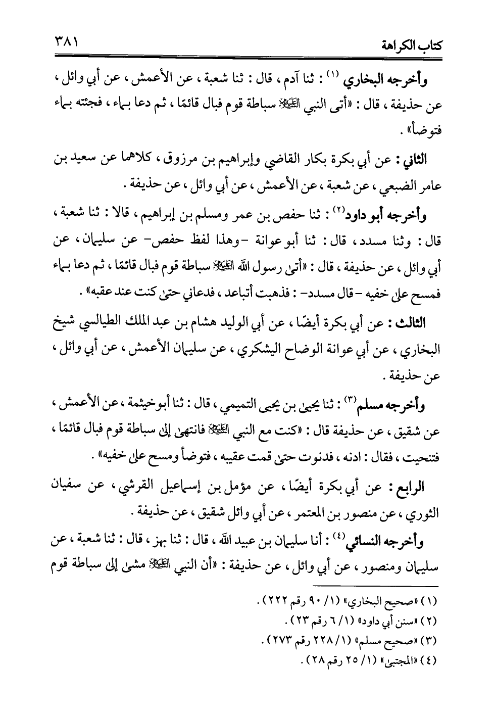 وأخرجه النسائي (¬4): أنا سليمان بن عبيد الله، قال: ثنا بهز، قال: ثنا شعبة، عن سليمان ومنصور، عن أبي وائل، عن حذيفة: "أن النبي -عليه السلام- مشى إلى سباطة قوم