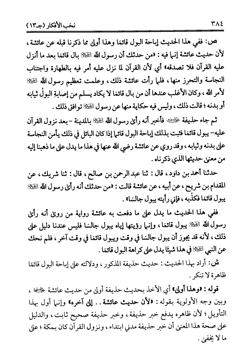 ص: ففي هذا الحديث إباحة البول قائمًا وهذا أولى مما ذكرنا قبله عن عائشة، لأن حديث عائشة إنما فيه: "من حدثك أن رسول الله -عليه السلام- بال قائمًا بعدما أنزل عليه القرآن فلا تصدقه" أي لأن القرآن لما نزل عليه أمر فيه بالطهارة واجتناب النجاسة والتحرز منها، فلما رأت عائشة ذلك، وعلمت تعظيم رسول الله -عليه السلام- لأمر الله، وكان الأغلب عندها أن من بال قائمًا لا يكاد يسلم من إصابةِ البولُ ثيابَه أو بدنه؛ قالت ذلك، وليس فيه حكاية منها عن رسول -عليه السلام- توافق ذلك.