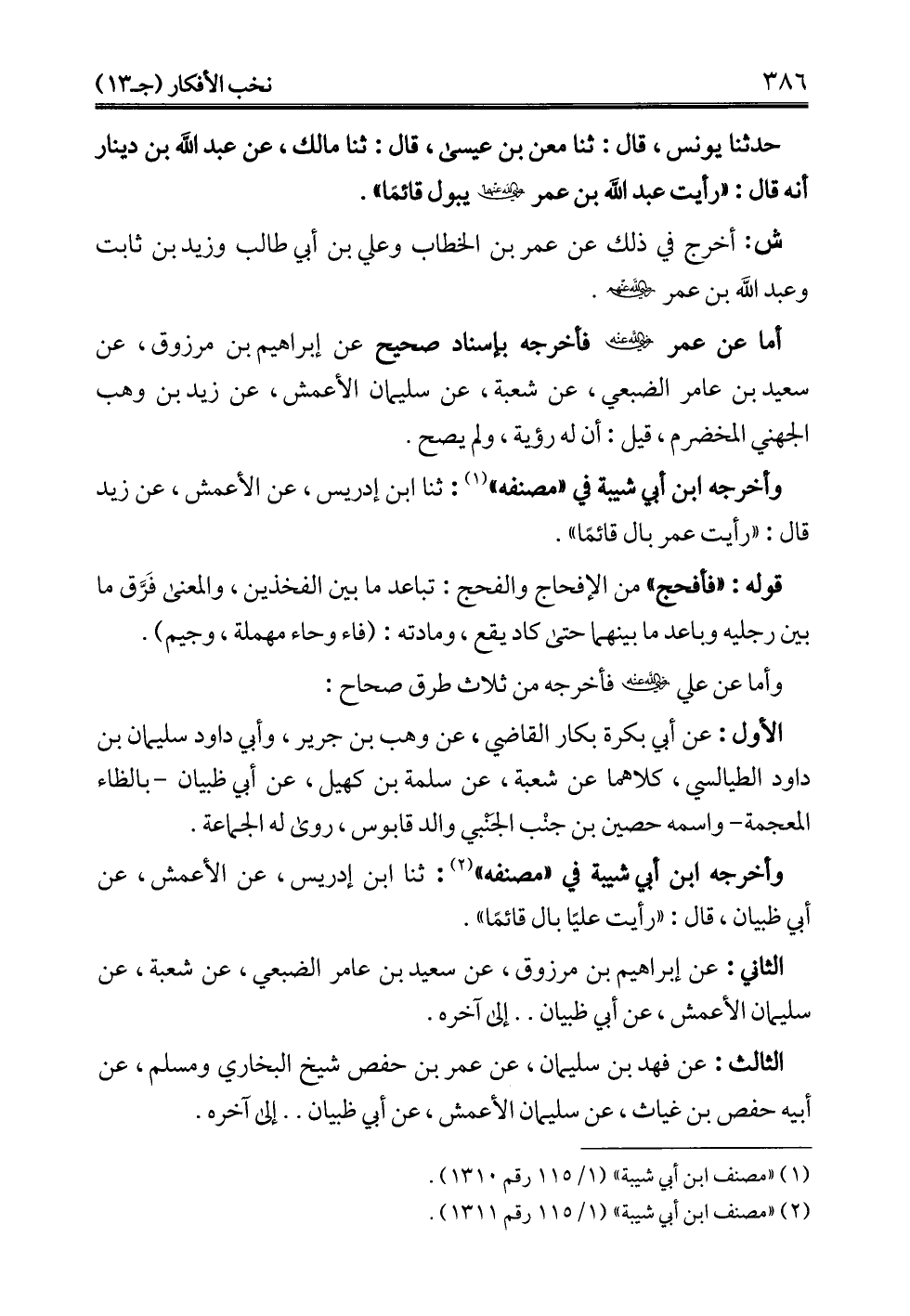 وأخرجه ابن أبي شيبة في "مصنفه" (¬1): ثنا ابن إدريس، عن الأعمش، عن زيد قال: "رأيت عمر بال قائمًا".