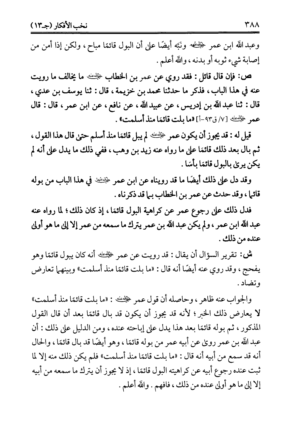والجواب عنه ظاهر، وحاصله أن قول عمر - رضي الله عنه -: "ما بلت قائمًا منذ أسلمت" لا يعارض ذلك الخبر؛ لأنه قد يجوز أن يكون قد بال قائمًا بعد أن قال القول المذكور، ثم بوله قائمًا بعد هذا يدل على إباحته عنده، ومن الدليل على ذلك: أن عبد الله بن عمر روى عن أبيه عمر من بوله قائمًا، وهو أيضًا قد بال قائمًا، والحال أنه قد سمع من أبيه أنه قال: "ما بلت قائمًا منذ أسلمت" فلم يكن ذلك منه إلا لما ثبت عنده رجوع أبيه عن كراهيته البول قائمًا، إذ لا يجوز أن يترك ما سمعه من أبيه إلا إلى ما هو أولى عنده من ذلك، فافهم. والله أعلم.