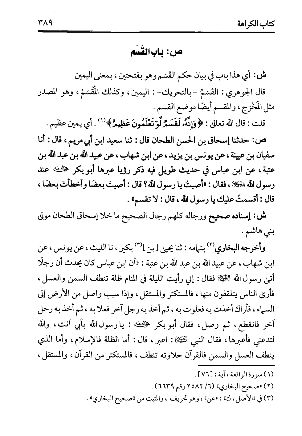 ص: حدثنا إسحاق بن الحسن الطحان قال: ثنا سعيد ابن أبي مريم، قال: أنا سفيان بن عيينة، عن يونس بن يزيد، عن ابن شهاب، عن عبيد الله بن عبد الله بن عتبة، عن ابن عباس في حديث طويل فيه ذكر رؤيا عبرها أبو بكر - رضي الله عنه - عند رسول الله -عليه السلام-، فقال: "أصبتُ يا رسول الله؟ قال: أصبتَ بعضًا وأخطأتَ بعضا، قال: أقسمتُ عليك يا رسول الله، قال: لا تقسم".