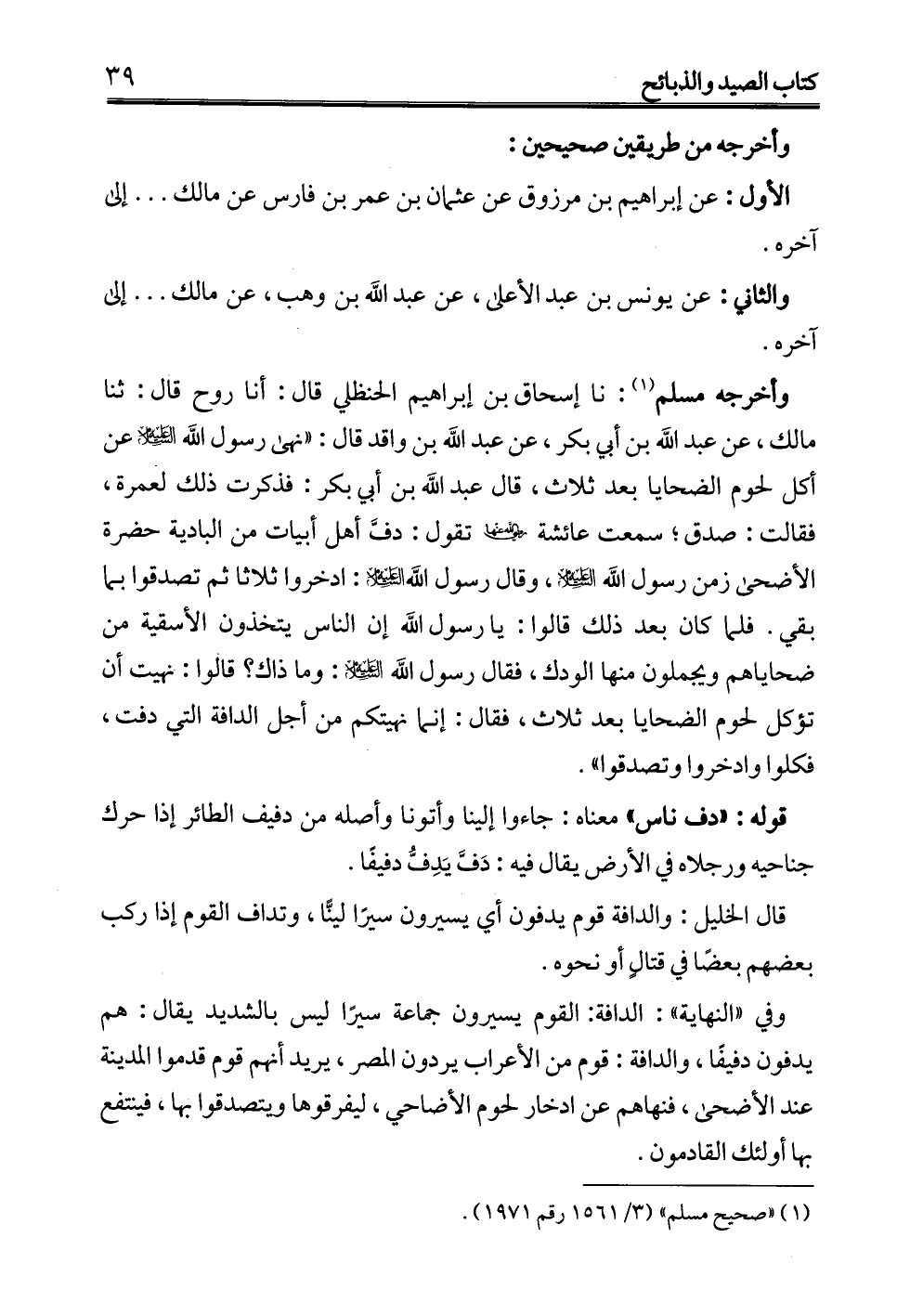 وأخرجه مسلم (¬1): نا إسحاق بن إبراهيم الحنظلي قال: أنا روح قال: ثنا مالك، عن عبد الله بن أبي بكر، عن عبد الله بن واقد قال: "نهى رسول الله -عليه السلام- عن أكل لحوم الضحايا بعد ثلاث، قال عبد الله بن أبي بكر: فذكرت ذلك لعمرة، فقالت: صدق؛ سمعت عائشة -رضي الله عنها- تقول: دفَّ أهل أبيات من البادية حضرة الأضحى زمن رسول الله -عليه السلام-، وقال رسول الله -عليه السلام-: ادخروا ثلاثاً ثم تصدقوا بما بقي. فلما كان بعد ذلك قالوا: يا رسول الله إن الناس يتخذون الأسقية من ضحاياهم ويجملون منها الودك، فقال رسول الله -عليه السلام-: وما ذاك؟ قالوا: نهيت أن تؤكل لحوم الضحايا بعد ثلاث، فقال: إنما نهيتكم من أجل الدافة التي دفت، فكلوا وادخروا وتصدقوا".