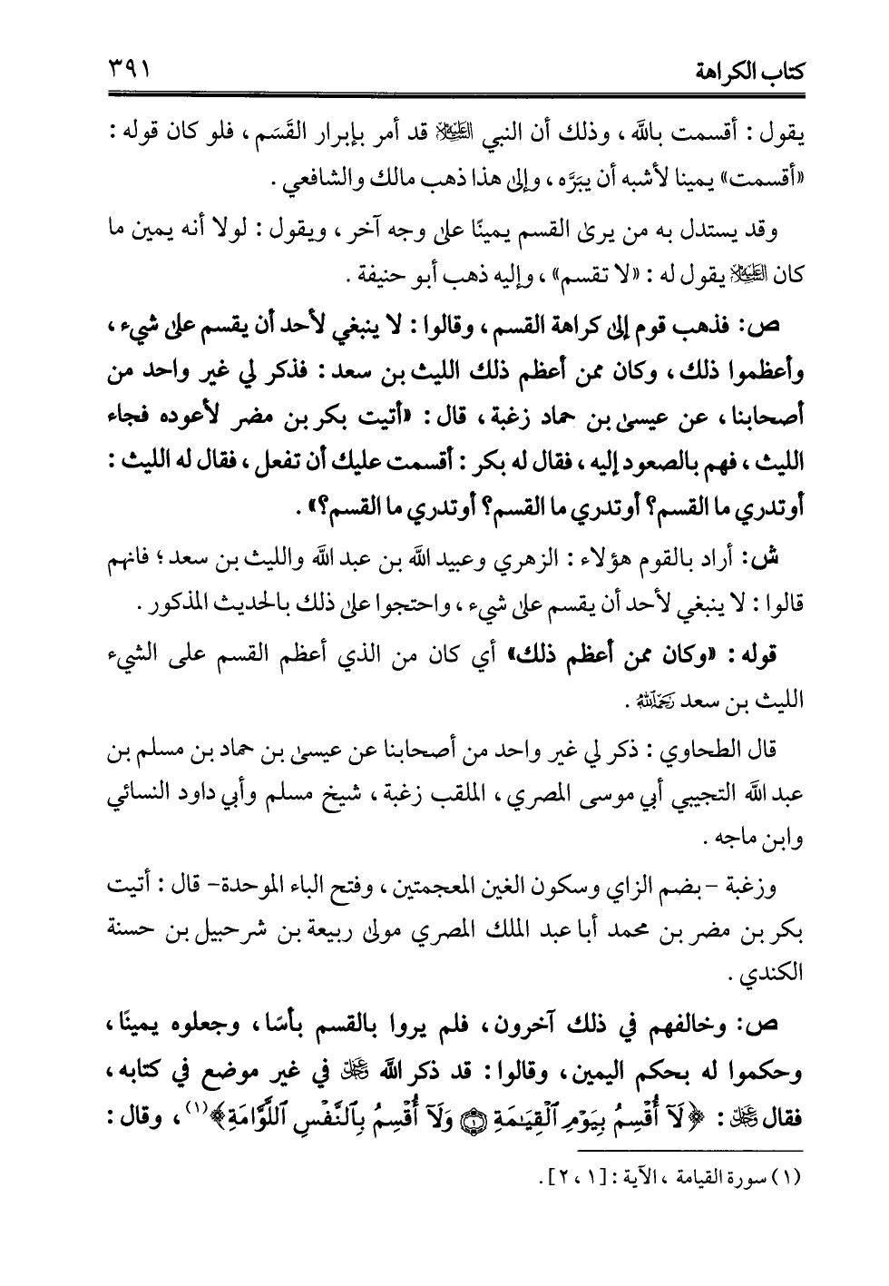 ص: وخالفهم في ذلك آخرون، فلم يروا بالقسم بأسًا، وجعلوه يمينًا، وحكموا له بحكم اليمين، وقالوا: قد ذكر الله -عز وجل- في غير موضع في كتابه، فقال -عز وجل-: {لَا أُقْسِمُ بِيَوْمِ الْقِيَامَةِ (¬1) وَلَا أُقْسِمُ بِالنَّفْسِ اللَّوَّامَةِ} (1)، وقال: