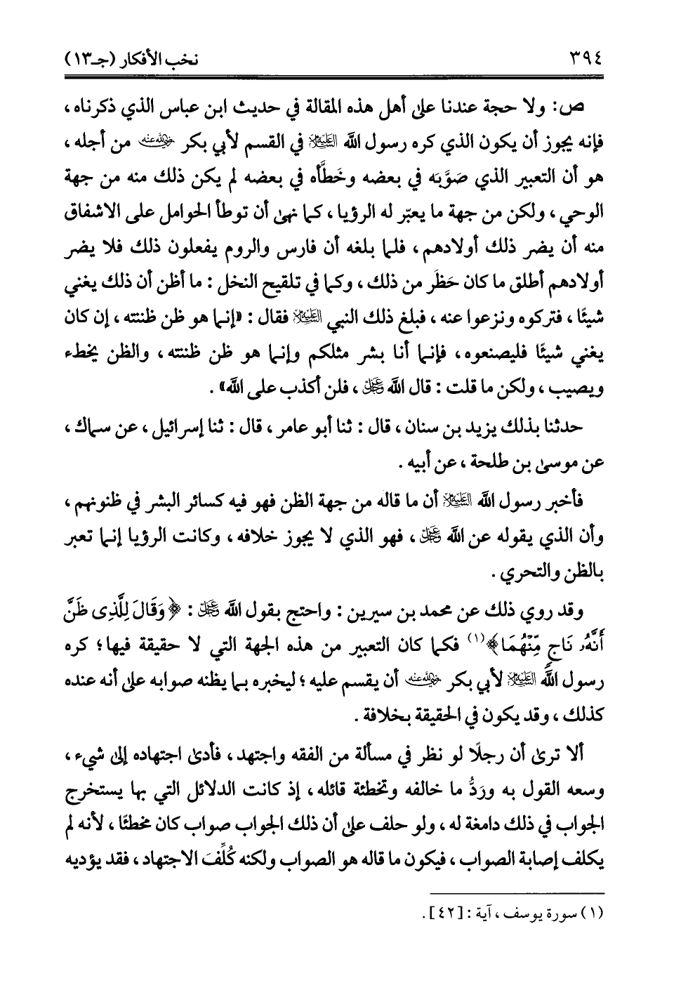 وقد روي ذلك عن محمَّد بن سيرين: واحتج بقول الله -عز وجل-: {وَقَالَ لِلَّذِي ظَنَّ أَنَّهُ نَاجٍ مِنْهُمَا} (¬1) فكما كان التعبير من هذه الجهة التي لا حقيقة فيها؛ كره رسول الله -عليه السلام- لأبي بكر - رضي الله عنه - أن يقسم عليه؛ ليخبره بما يظنه صوابه على أنه عنده كذلك، وقد يكون في الحقيقة بخلافة.