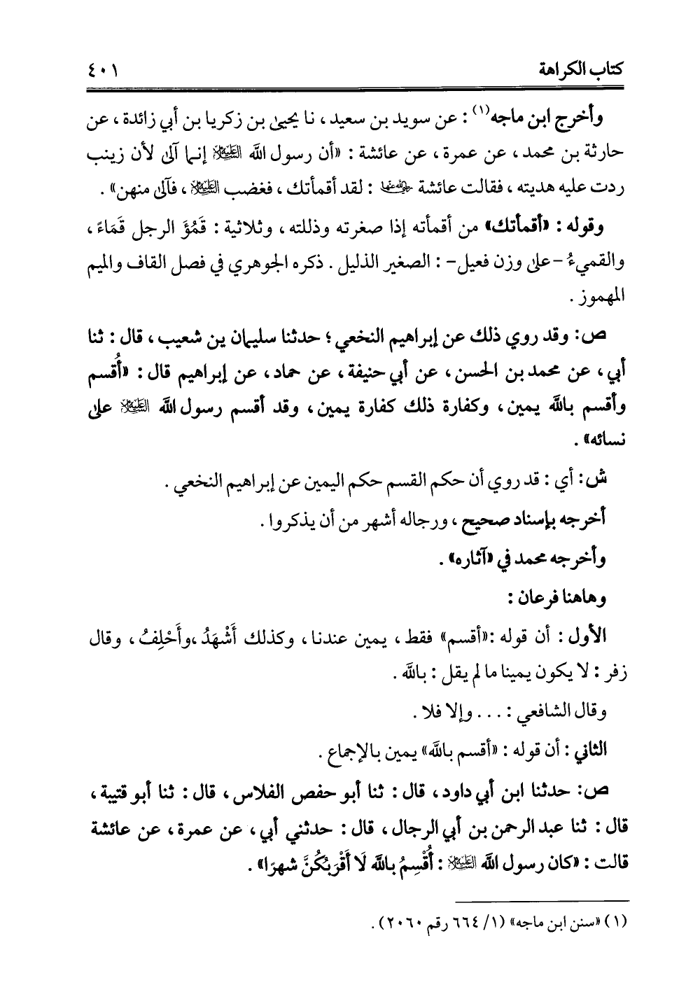 ص: وقد روي ذلك عن إبراهيم النخعي؛ حدثنا سليمان بن شعيب، قال: ثنا أبي، عن محمَّد بن الحسن، عن أبي حنيفة، عن حماد، عن إبراهيم قال: "أُقسم وأقسم بالله يمين، وكفارة ذلك كفارة يمين، وقد أقسم رسول الله -عليه السلام- على نسائه".