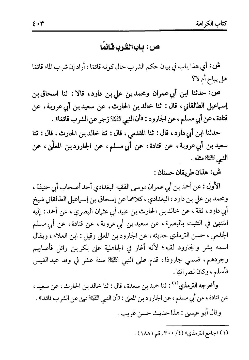 الأول: عن أحمد بن أبي عمران موسى الفقيه البغدادي أحد أصحاب أبي حنيفة، ومحمد بن علي بن داود، البغدادي، كلاهما عن إسحاق بن إسماعيل الطالقاني شيخ أبي داود، ثقة، عن خالد بن الحارث بن عبيد أبي عثمان البصري، عن أحمد: إليه المنتهى في التثبت بالبصرة، عن سعيد بن أبي عروبة، عن قتادة، عن أبي مسلم الجذمي، حسن الترمذي حديثه، عن الجارود بن المعلى وقيل: ابن العلاء، ويقال اسمه بشر والجارود لقبه؛ لأنه أغار في الجاهلية على بكر بن وائل فأصابهم وجردهم، فسمي جارودًا، قدم على النبي -عليه السلام- سنة عشر في وفد عبد القيس فأسلم، وكان نصرانيًا.