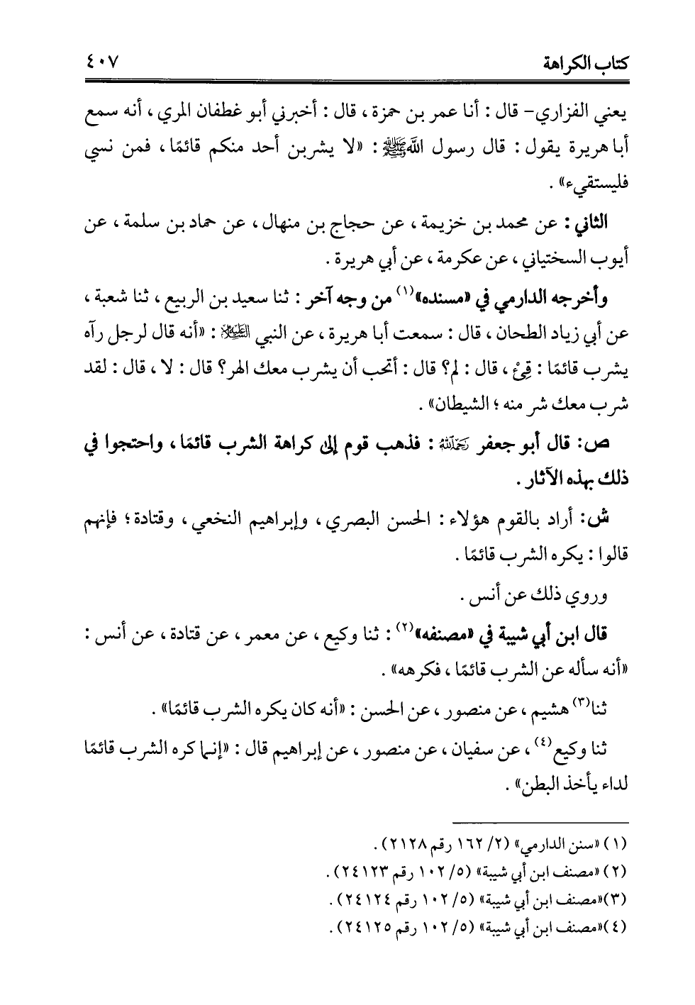 ثنا وكيع (¬4)، عن سفيان، عن منصور، عن إبراهيم قال: "إنما كره الشرب قائمًا لداء يأخذ البطن".