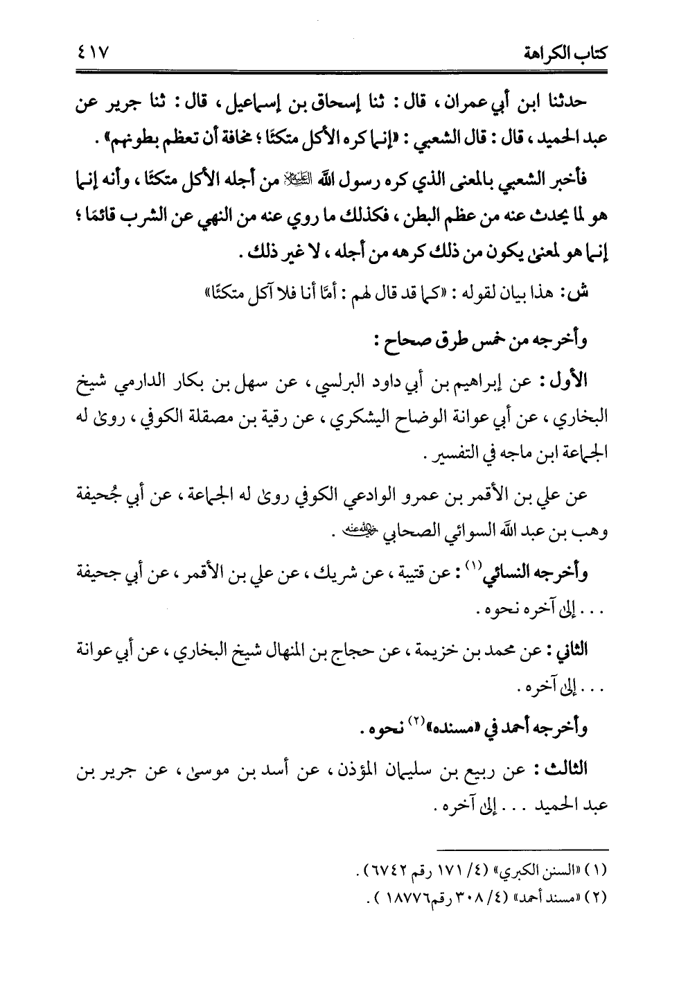 حدثنا ابن أبي عمران، قال: ثنا إسحاق بن إسماعيل، قال: ثنا جرير عن عبد الحميد، قال: قال الشعبي: "إنما كره أكل متكئًا؛ مخافة أن تعظم بطونهم".