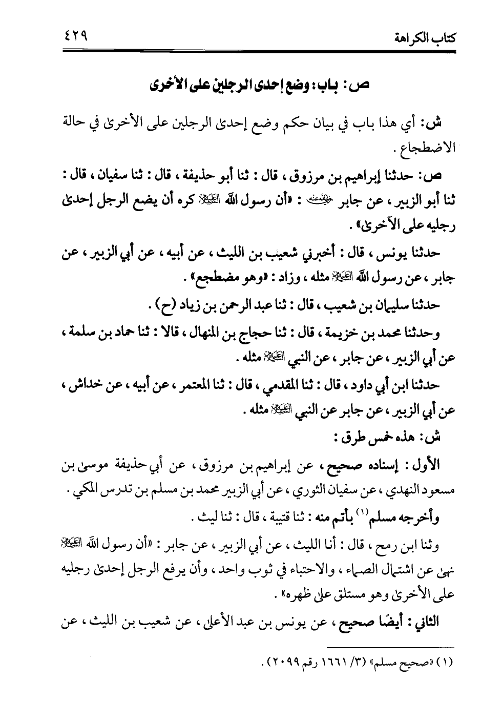 وثنا ابن رمح، قال: أنا الليث، عن أبي الزبير، عن جابر: "أن رسول الله -عليه السلام- نهى عن اشتمال الصماء، والاحتباء في ثوب واحد، وأن يرفع الرجل إحدى رجليه على الأخرى وهو مستلق علي ظهره".