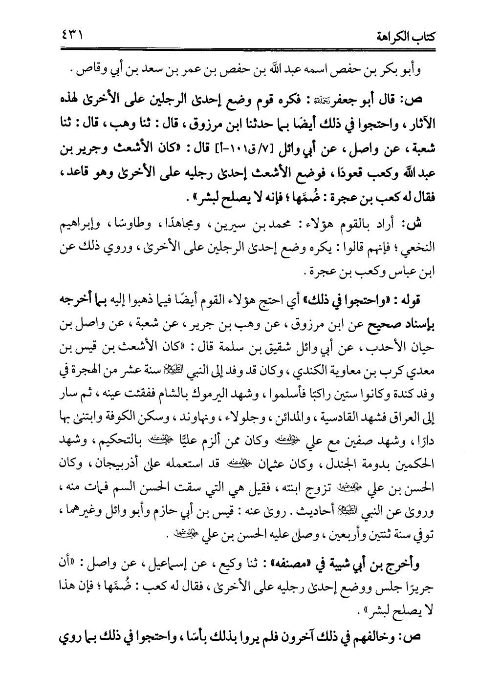 وأخرج بن أبي شيبة في "مصنفه": ثنا وكيع، عن إسماعيل، عن واصل: "أن جريرًا جلس ووضع إحدى رجليه على الأخرى، فقال له كعب: ضُمَّها؛ فإن هذا لا يصلح لبشر".