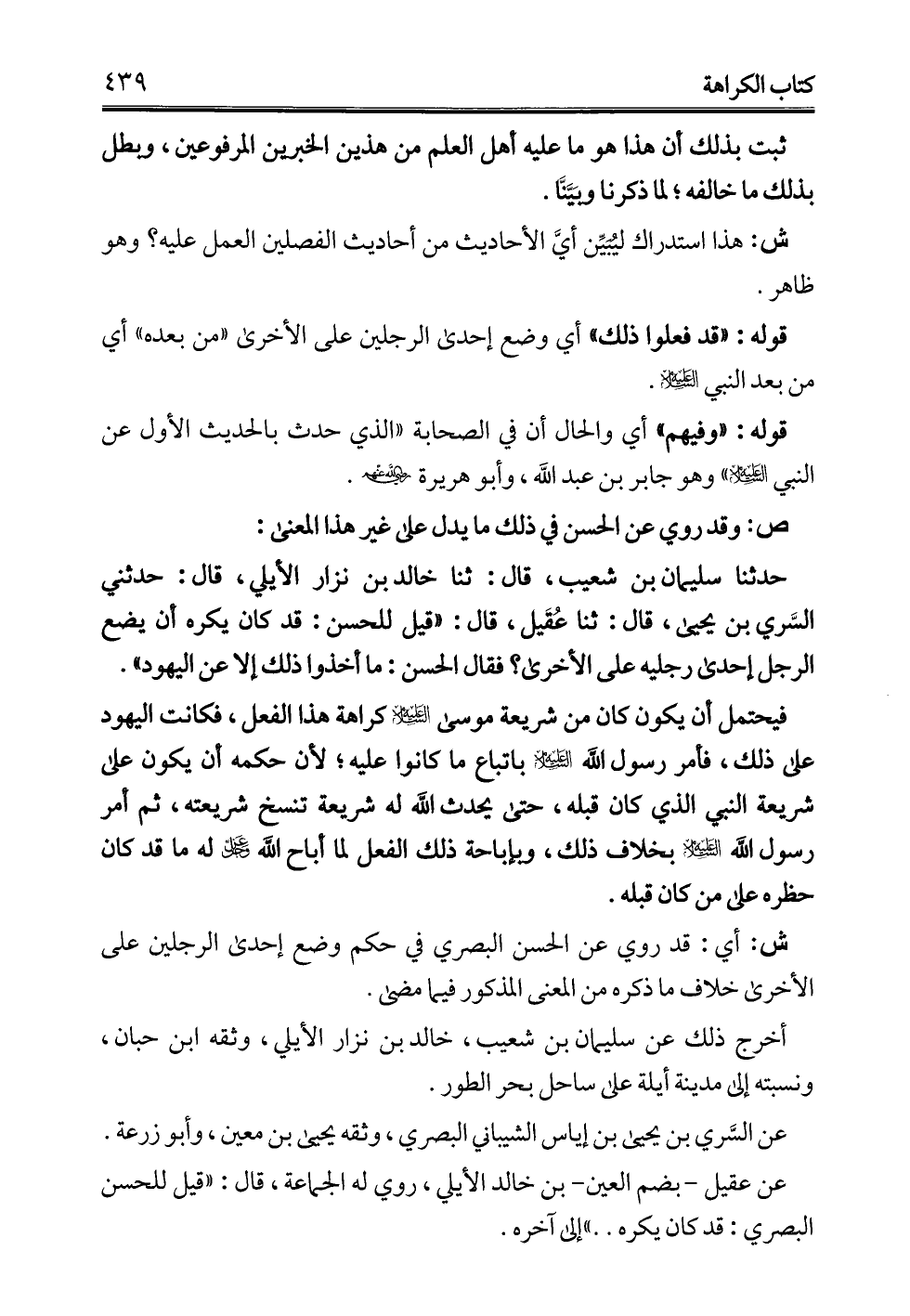حدثنا سليمان بن شعيب، قال: ثنا خالد بن نزار الأيلي، قال: حدثني السَّري بن يحيي، قال: ثنا عُقَيل، قال: "قيل للحسن: قد كان يكره أن يضع الرجل إحدى رجليه على الأخرى؟ فقال الحسن: ما أخذوا ذلك إلا عن اليهود".