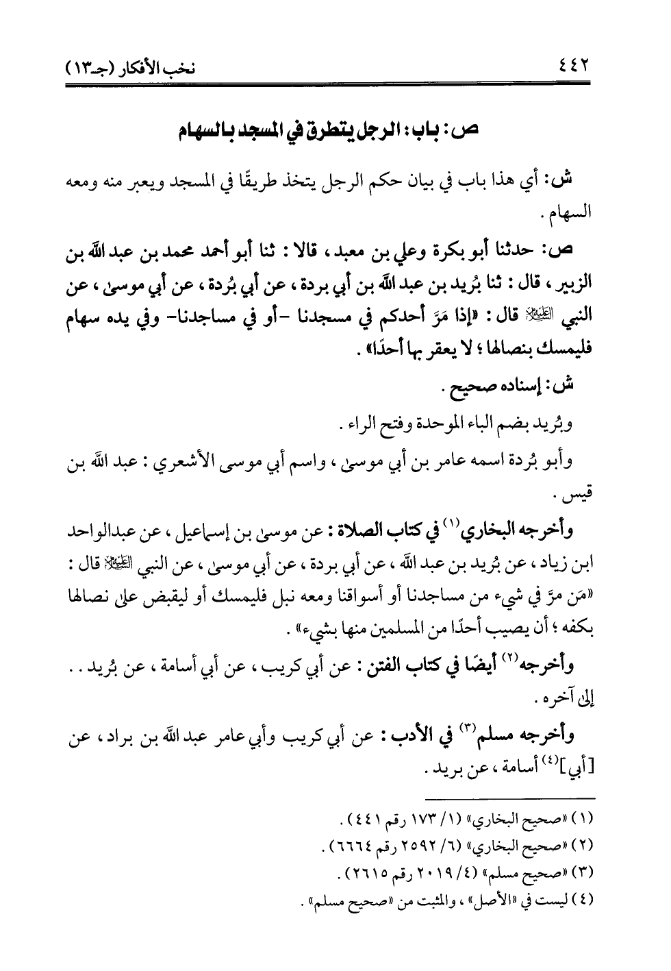 ص: حدثنا أبو بكرة وعلي بن معبد، قالا: ثنا أبو أحمد محمَّد بن عبد الله بن الزبير، قال: ثنا بُريد بن عبد الله بن أبي بُردة، عن أبي بُردة، عن أبي موسى، عن النبي -عليه السلام- قال: "إذا مَرَّ أحدكم في مسجدنا -أو في مساجدنا- وفي يده سهام فليمسك بنصالها؛ لا يعقر بها أحدًا".