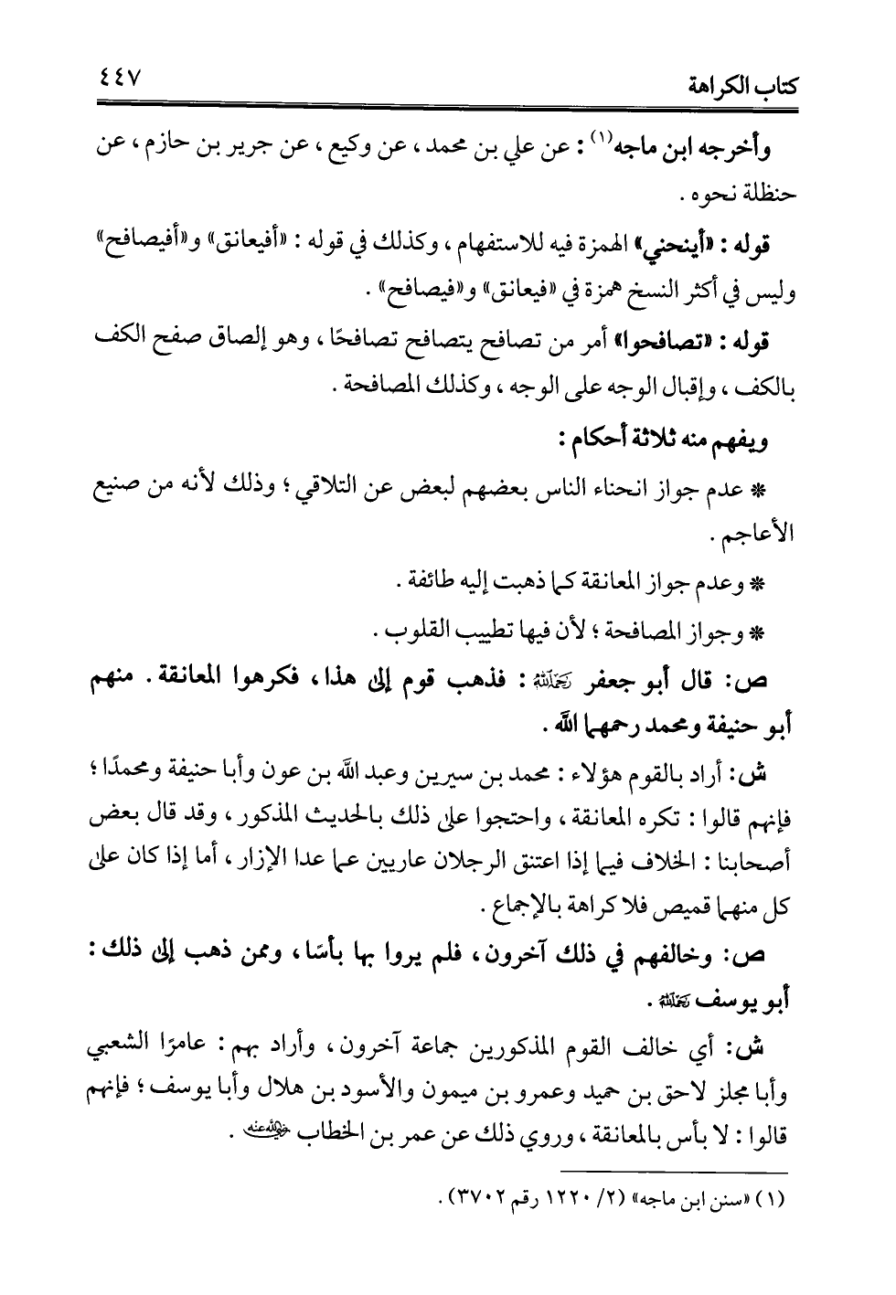 ش: أراد بالقوم هؤلاء: محمَّد بن سيرين وعبد الله بن عون وأبا حنيفة ومحمدًا؛ فإنهم قالوا: تكره المعانقة، واحتجوا علي ذلك بالحديث المذكور، وقد قال بعض أصحابنا: الخلاف فيما إذا اعتنق الرجلان عاريين عما عدا الإزار، أما إذا كان على كل منهما قميص فلا كراهة بالإجماع.