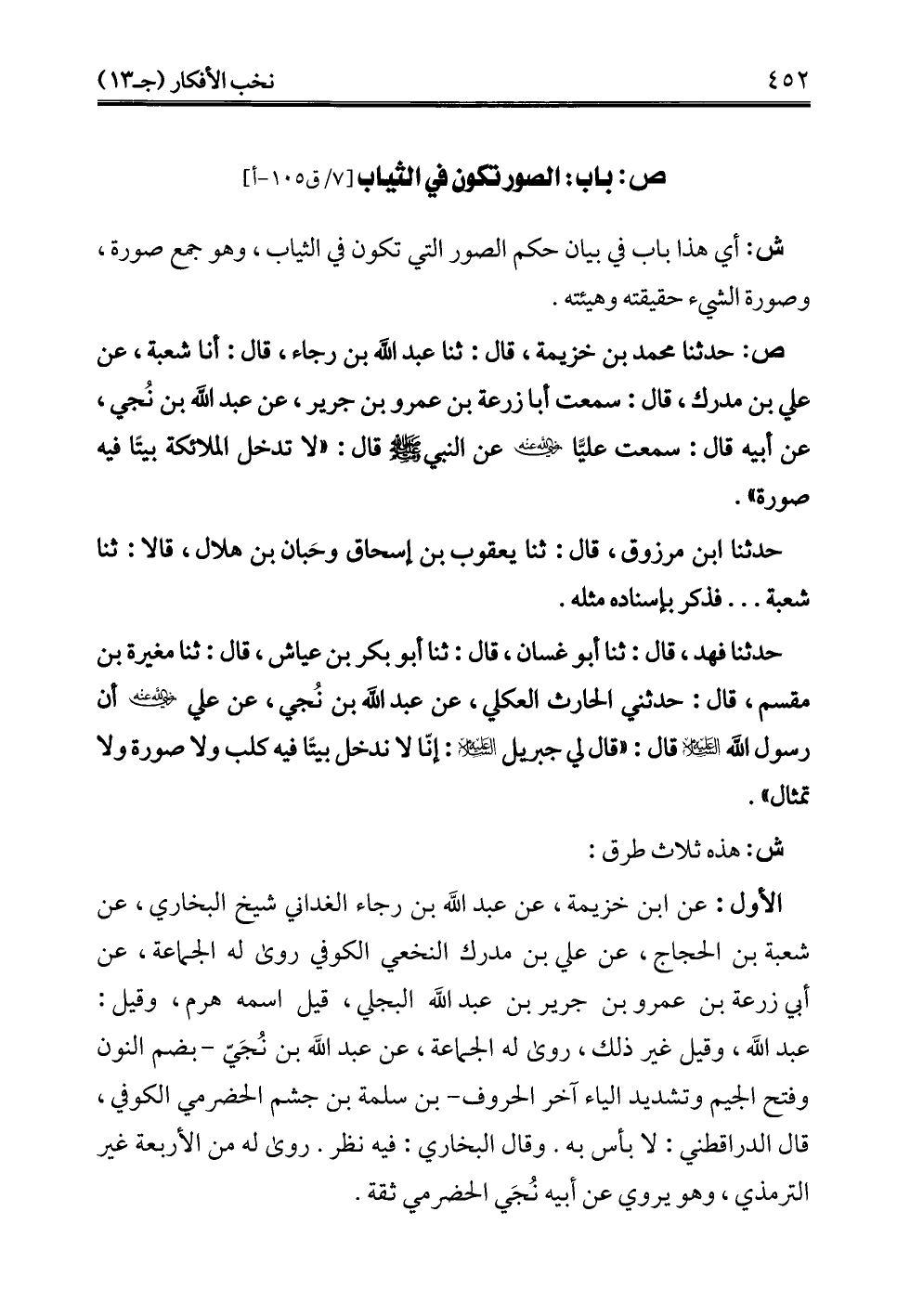 ص: حدثنا محمَّد بن خزيمة، قال: ثنا عبد الله بن رجاء، قال: أنا شعبة، عن علي بن مدرك، قال: سمعت أبا زرعة بن عمرو بن جرير، عن عبد الله بن نُجي، عن أبيه قال: سمعت عليًّا - رضي الله عنه - عن النبي - صلى الله عليه وسلم - قال: "لا تدخل الملائكة بيتًا فيه صورة".