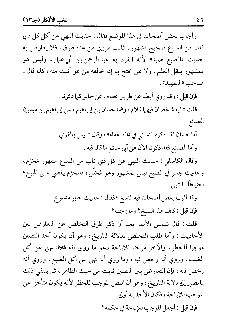 وقال الكاساني: حديث النهي عن كل ذي ناب من السباع مشهور مُحَرِّم، وحديث جابر في الضبع ليس بمشهور وهو مُحَلِّل، فالمحرِّم يقضي على المبيح؛ احتياطًا. انتهى.