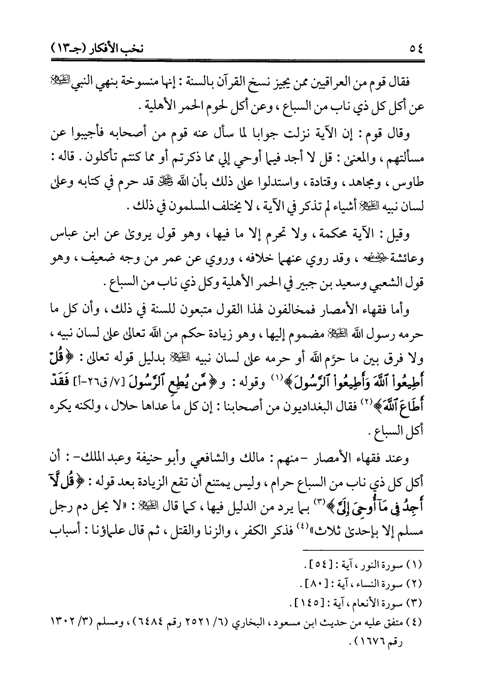 وأما فقهاء الأمصار فمخالفون لهذا القول متبعون للسنة في ذلك، وأن كل ما حرمه رسول الله -عليه السلام- مضموم إليها، وهو زيادة حكم من الله تعالى على لسان نبيه، ولا فرق بين ما حرَّم الله أو حرمه على لسان نبيه -عليه السلام- بدليل قوله تعالى: {قُلْ أَطِيعُوا اللَّهَ وَأَطِيعُوا الرَّسُولَ} (¬1) وقوله: و {مَنْ يُطِعِ الرَّسُولَ فَقَدْ أَطَاعَ اللَّهَ} (¬2) فقال البغداديون من أصحابنا: إن كل ما عداها حلال، ولكنه يكره أكل السباع.