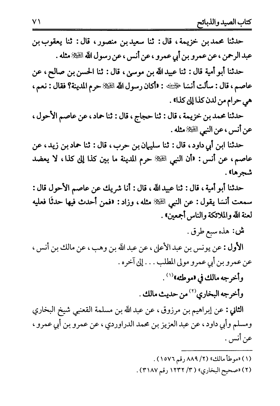 حدثنا ابن أبي داود، قال: ثنا سليمان بن حرب، قال: ثنا حماد بن زيد، عن عاصم، عن أنس "أن النبي -عليه السلام- حرم المدينة ما بين كذا إلى كذا، لا يعضد شجرها".
