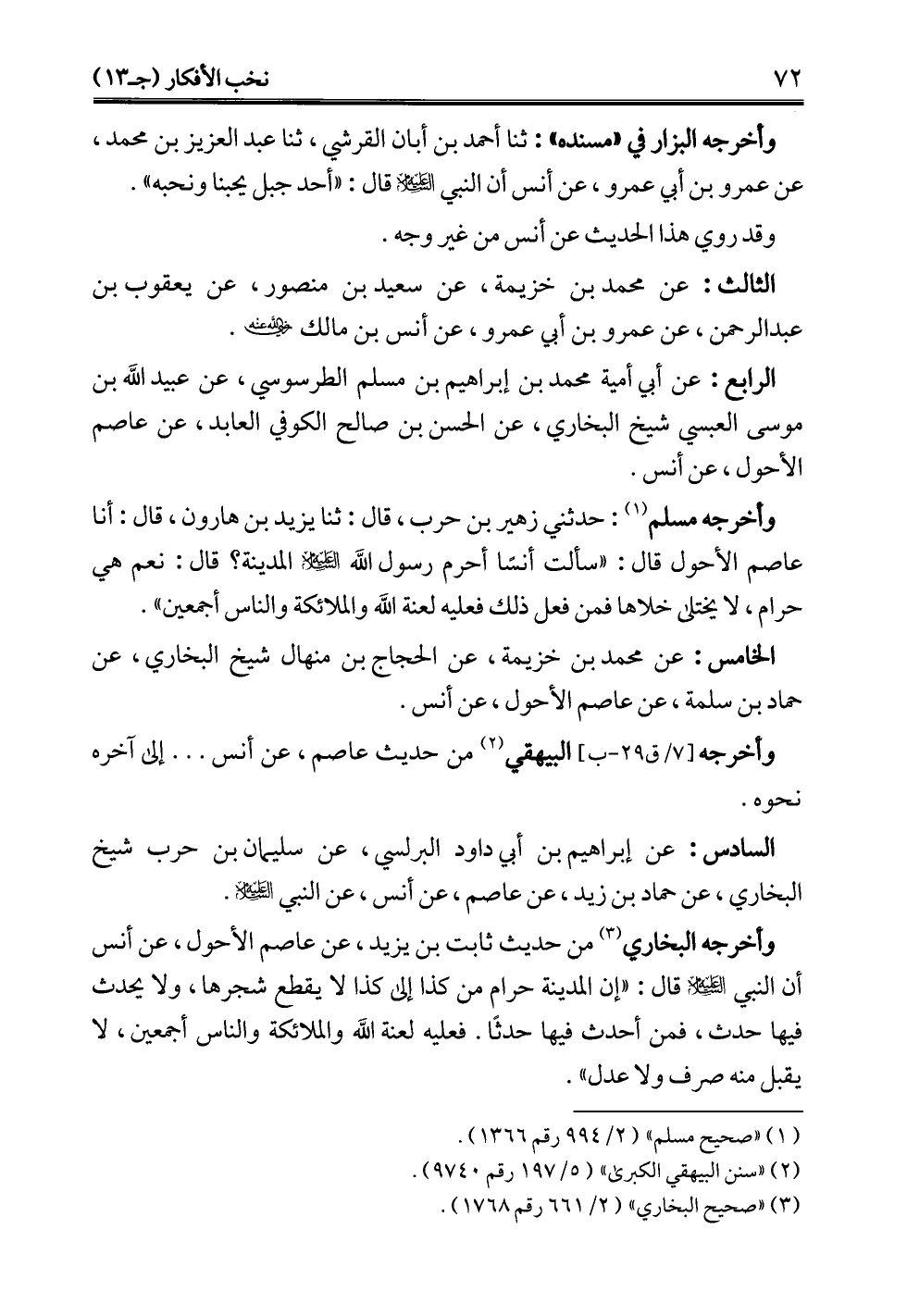 وأخرجه البزار في "مسنده": ثنا أحمد بن أبان القرشي، ثنا عبد العزيز بن محمد، عن عمرو بن أبي عمرو، عن أنس أن النبي -عليه السلام- قال: "أحد جبل يحبنا ونحبه".