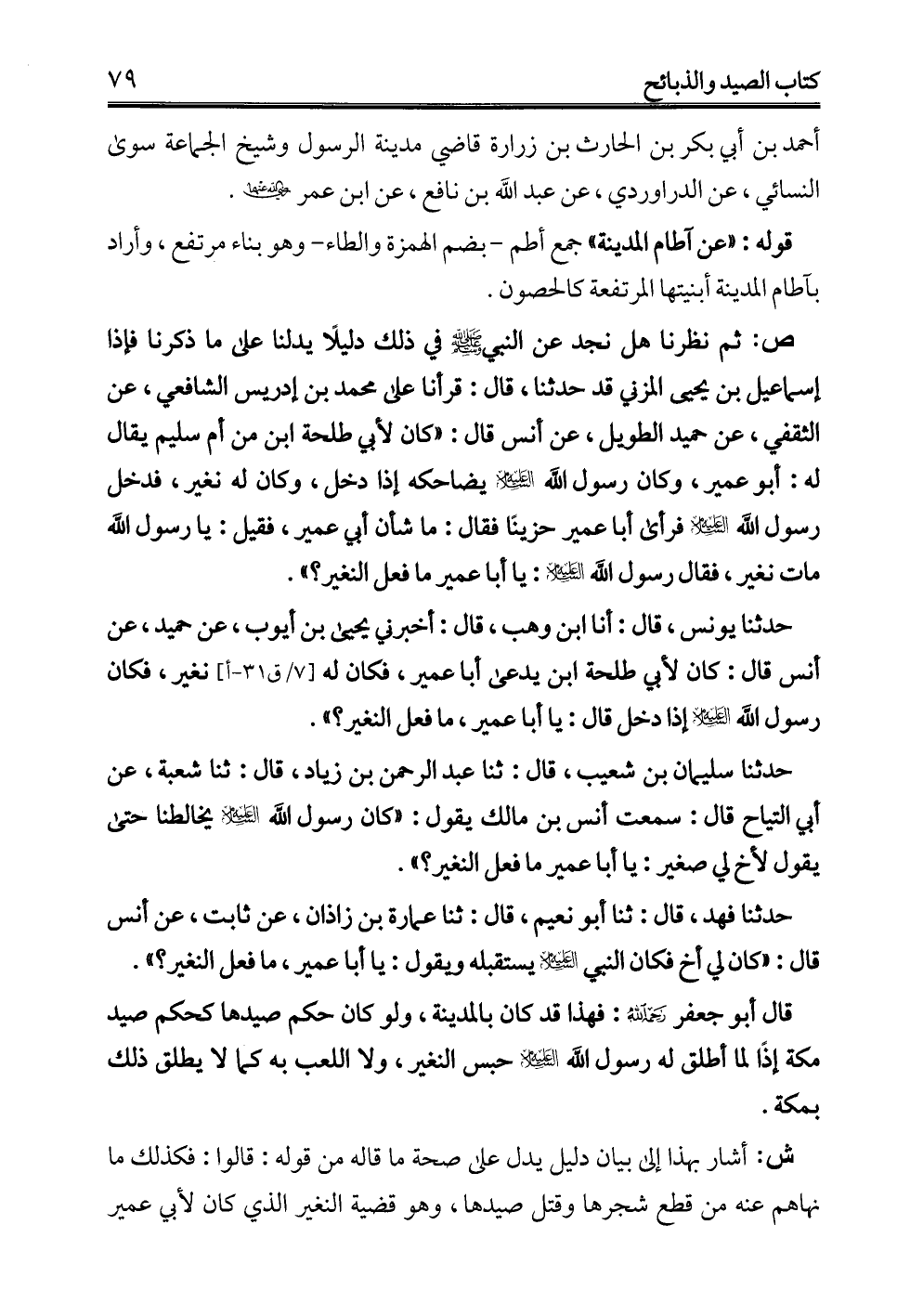 قال أبو جعفر -رحمه الله-: فهذا قد كان بالمدينة، ولو كان حكم صيدها كحكم صيد مكة إذًا لما أطلق له رسول الله -عليه السلام- حبس النغير، ولا اللعب به كما لا يطلق ذلك بمكة.