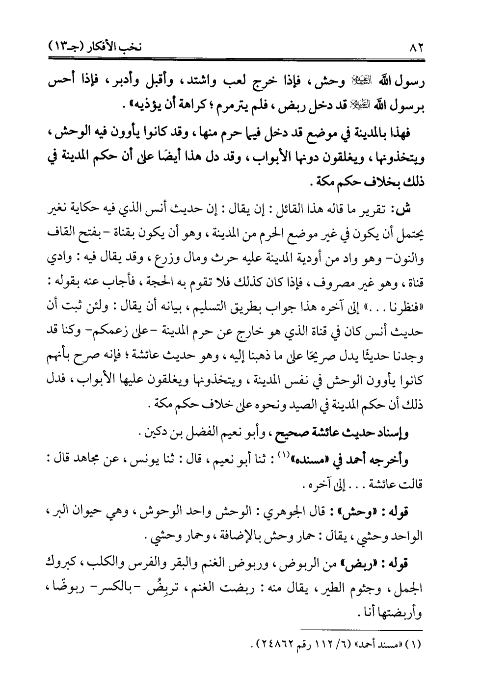 ش: تقرير ما قاله هذا القائل: إن يقال: إن حديث أنس الذي فيه حكايه نغير يحتمل أن يكون في غير موضع الحرم من المدينة، وهو أن يكون بقناة -بفتح القاف والنون- وهو واد من أودية المدينة عليه حرث ومال وزرع، وقد يقال فيه: وادي قناة، وهو غير مصروف، فإذا كان كذلك فلا تقوم به الحجة، فأجاب عنه بقوله: "فنظرنا. . ." إلى آخره هذا جواب بطريق التسليم، بيانه أن يقال: ولئن ثبت أن حديث أنس كان في قناة الذي هو خارج عن حرم المدينة -على زعمكم- وكنا قد وجدنا حديثًا يدل صريحًا على ما ذهبنا إليه، وهو حديث عائشة؛ فإنه صرح بأنهم كانوا يأوون الوحش في نفس المدينة، ويتخذونها ويغلقون عليها الأبواب، فدل ذلك أن حكم المدينة في الصيد ونحوه على خلاف حكم مكة.