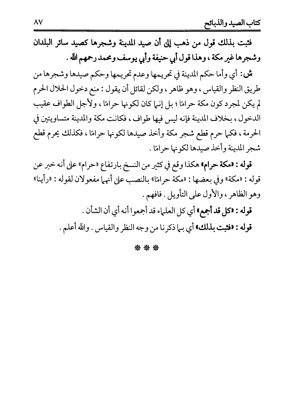 ش: أي وأما حكم المدينة في تحريمها وعدم تحريمها وحكم صيدها وشجرها من طريق النظر والقياس، وهو ظاهر، ولكن لقائل أن يقول: منع دخول الحلال الحرم لم يكن لمجرد كون مكة حرامًا؛ بل إنما كان لكونها حرامًا, ولأجل الطواف عقيب الدخول، بخلاف المدينة فإنه ليس فيها طواف، فكانت مكة والمدينة متساويتين في الحرمة، فكما حرم قطع شجر مكة وأخذ صيدها لكوخها حرامًا، فكذلك يحرم قطع شجر المدينة وأخذ صيدها لكونها حرامًا.