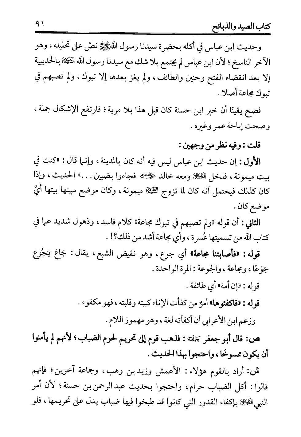 وحديث ابن عباس في أكله بحضرة سيدنا رسول الله - صلى الله عليه وسلم - نصَّ على تحليله، وهو الآخر الناسخ؛ لأن ابن عباس لم يجتمع بلا شك مع سيدنا رسول الله -عليه السلام- بالحديبية إلا بعد انقضاء الفتح وحنين والطائف، ولم يغز بعدها إلا تبوك، ولم تصبهم في تبوك مجاعة أصلاً.