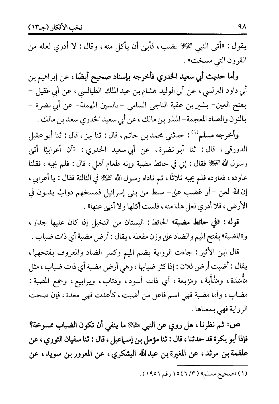 وأخرجه مسلم (¬1): حدثني محمد بن حاتم، قال: ثنا بهز، قال: ثنا أبو عقيل الدورقي، قال: ثنا أبو نضرة، عن أبي سعيد الخدري: "أن أعرابيًّا أتى رسول الله -عليه السلام- فقال: إني في حائط مضبة وإنه طعام أهلي، قال: فلم يجبه، فقلنا عاوده، فعاوده فلم يجبه ثلاثًا، ثم ناداه رسول الله -عليه السلام- في الثالثة فقال: يا أعرابي، إن الله لعن -أو غضب على- سبط من بني إسرائيل فمسخهم دوابَّ يدبون في الأرض، فلا أدري لعل هذا منه، فلست آكلها ولا أنهى عنها".