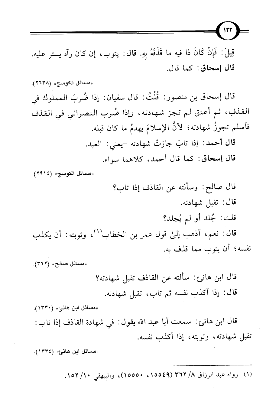 قال إسحاق بن منصور: قُلْتُ: قال سفيان: إذا ضُربَ المملوك في القذفِ، ثم أعتق لم تجز شهادته، وإذا ضُرب النصراني في القذف فأسلم تجوزُ شهادته؛ لأنَّ الإسلامَ يهدمُ ما كان قبله.