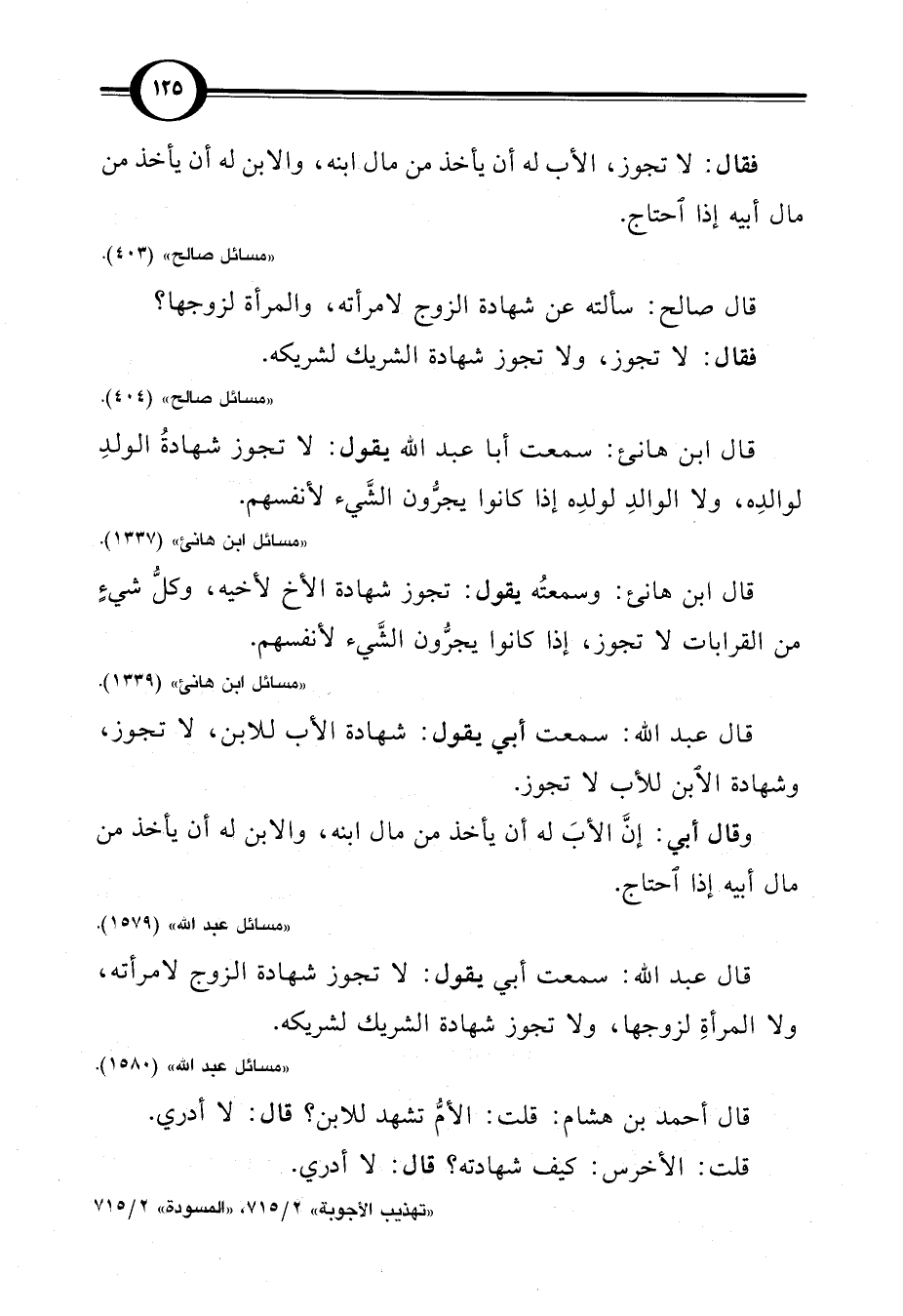 قال ابن هانئ: سمعت أبا عبد اللَّه يقول: لا تجوز شهادةُ الولدِ لوالدِه، ولا الوالدِ لولدِه إذا كانوا يجرُّون الشَّيء لأنفسهم.