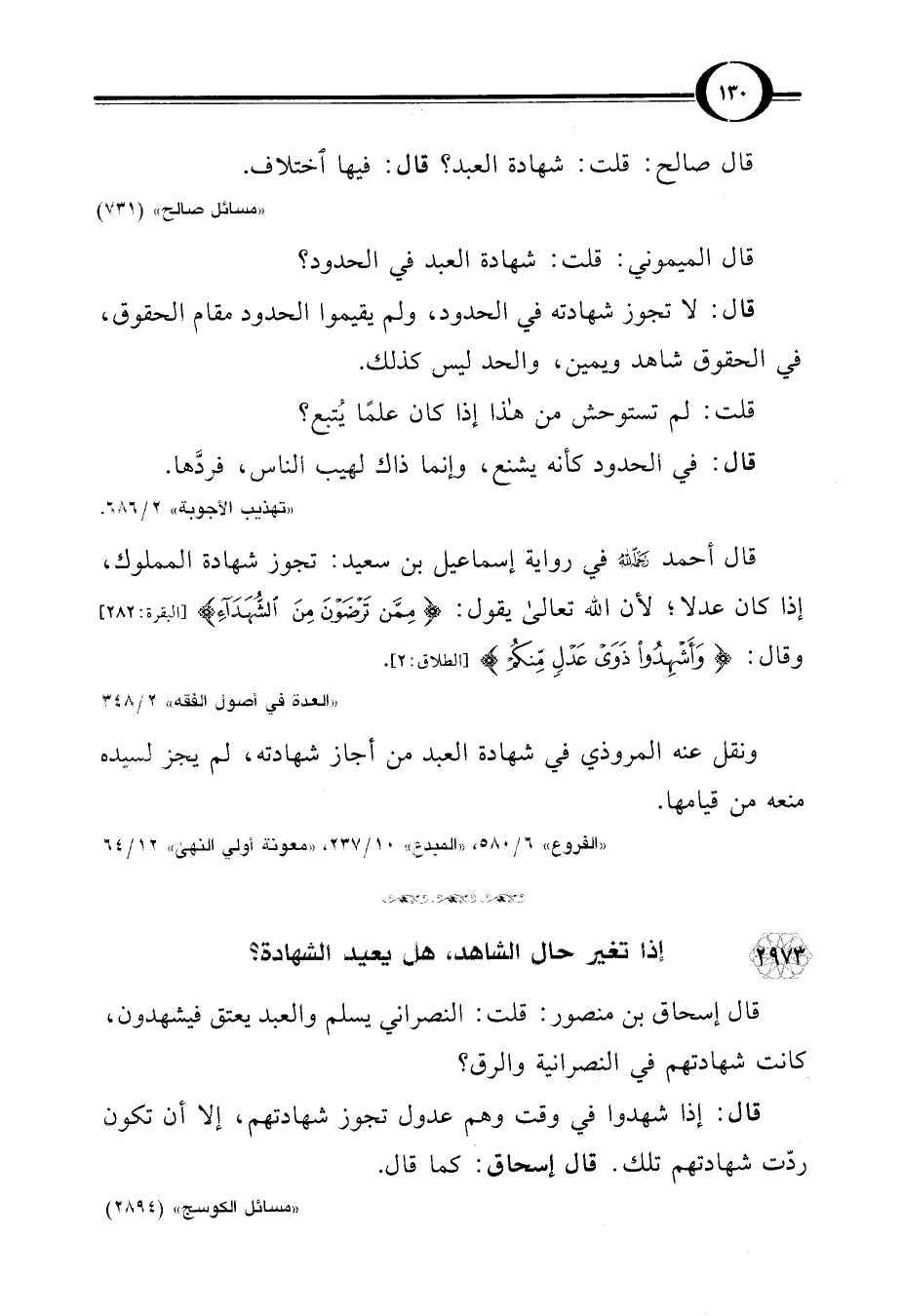 قال أحمد -رحمه اللَّه- في رواية إسماعيل بن سعيد: تجوز شهادة المملوك، إذا كان عدلا؛ لأن اللَّه تعالى يقول {مِمَّنْ تَرْضَوْنَ مِنَ الشُّهَدَاءِ} [البقرة: 282] وقال: {وَأَشْهِدُوا ذَوَيْ عَدْلٍ مِنْكُمْ} [الطلاق: 2].