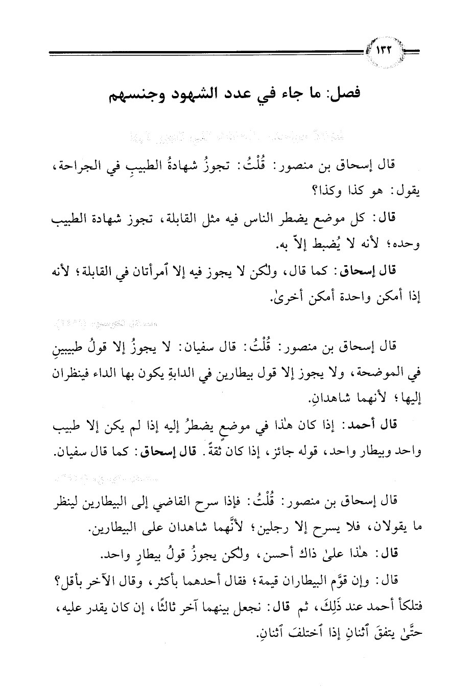 قال إسحاق بن منصور: قُلْتُ: قال سفيان: لا يجوزُ إلا قولُ طبيبينِ في الموضحة، ولا يجوز إلا قول بيطارين في الدابةِ يكون بها الداء فينظران إليها؛ لأنهما شاهدانِ.