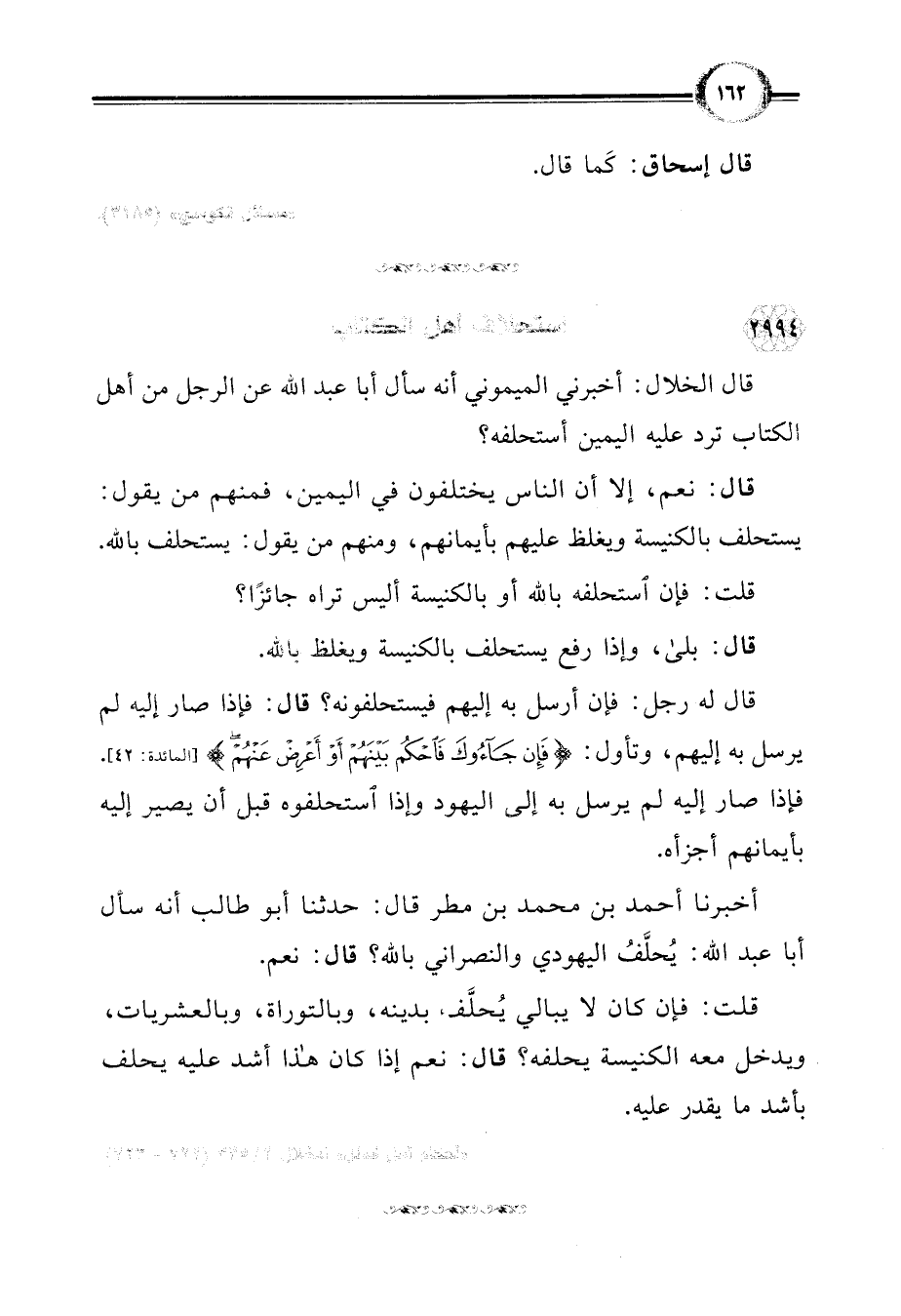 أخبرنا أحمد بن محمد بن مطر قال: حدثنا أبو طالب أنه سأل أبا عبد اللَّه: يُحلَّفُ اليهودي والنصراني باللَّه؟ قال: نعم.