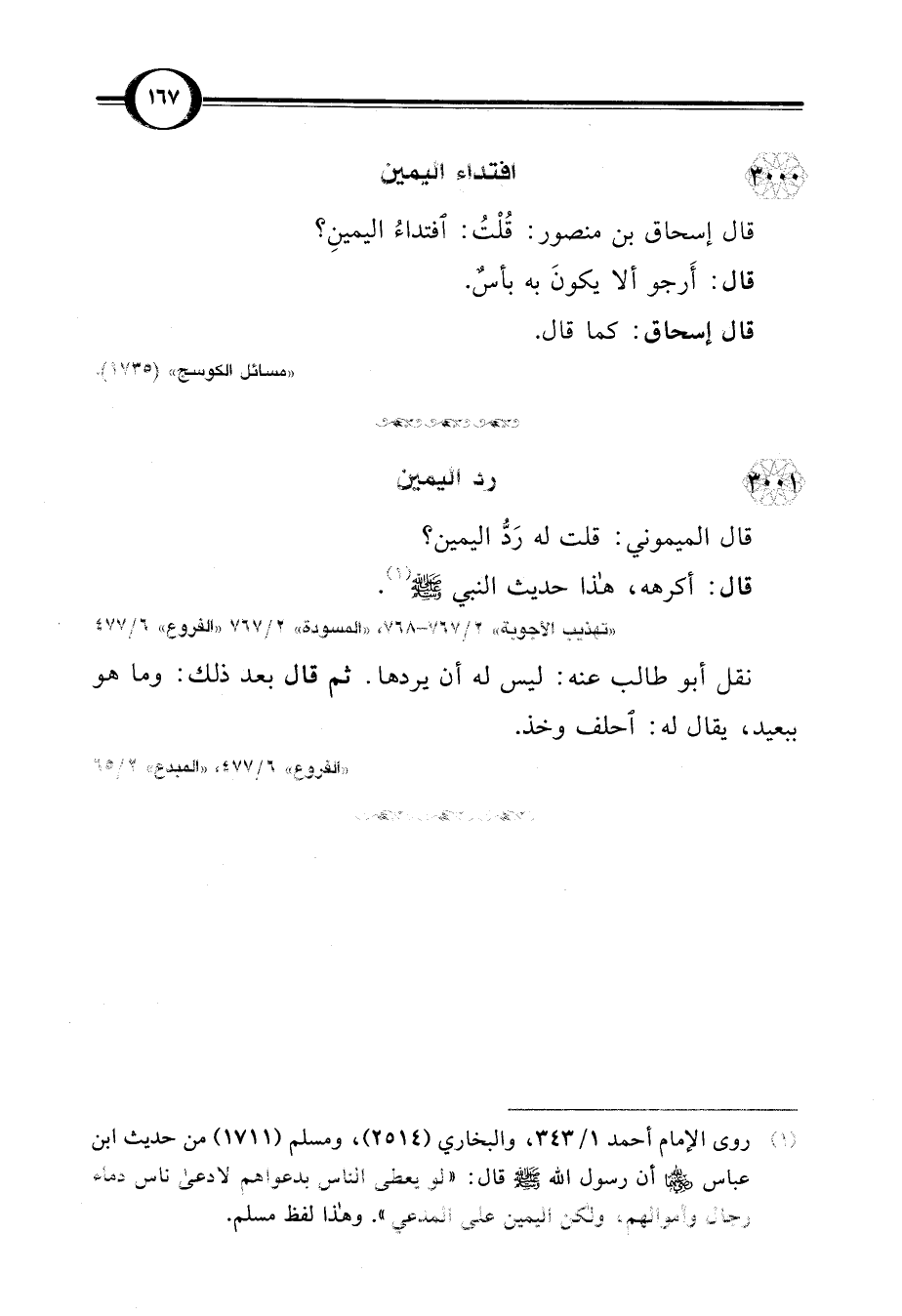 (¬1) روى الإمام أحمد 1/ 343، والبخاري (2514)، ومسلم (1711) من حديث ابن عباس -رضي اللَّه عنهما- أن رسول اللَّه -صلى اللَّه عليه وسلم- قال: "لو يعطى الناس بدعواهم لادعى ناس دماء رجال وأموالهم، ولكن اليمين على المدعي". وهذا لفظ مسلم.