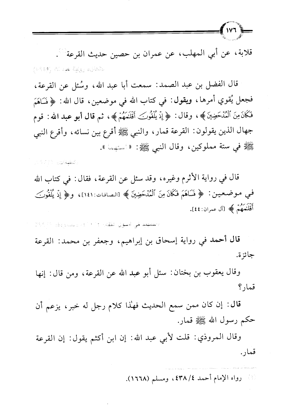 قال الفضل بن عبد الصمد: سمعت أبا عبد اللَّه، وسُئل عن القرعة، فجعل يُقوي أمرها، وبقول: في كتاب اللَّه في موضعين، قال اللَّه: {فَسَاهَمَ فَكَانَ مِنَ الْمُدْحَضِينَ} وقال: {إِذْ يُلْقُونَ أَقْلَامَهُمْ}، ثم قال أبو عبد اللَّه: قوم جهال الذين يقولون: القرعة قمار، والنبي -صلى اللَّه عليه وسلم- أقرع بين نسائه، وأقرع النبي -صلى اللَّه عليه وسلم- في ستة مملوكين، وقال النبي -صلى اللَّه عليه وسلم-: "استهما".