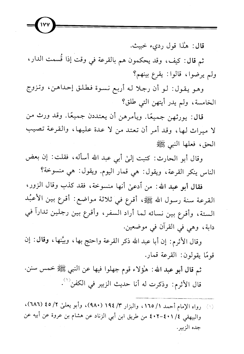 وقال الأثرم: إن أبا عبد اللَّه ذكر القرعة واحتج بها، وبيَّنها، وقال: إن قومًا يقولون: القرعة قمار.