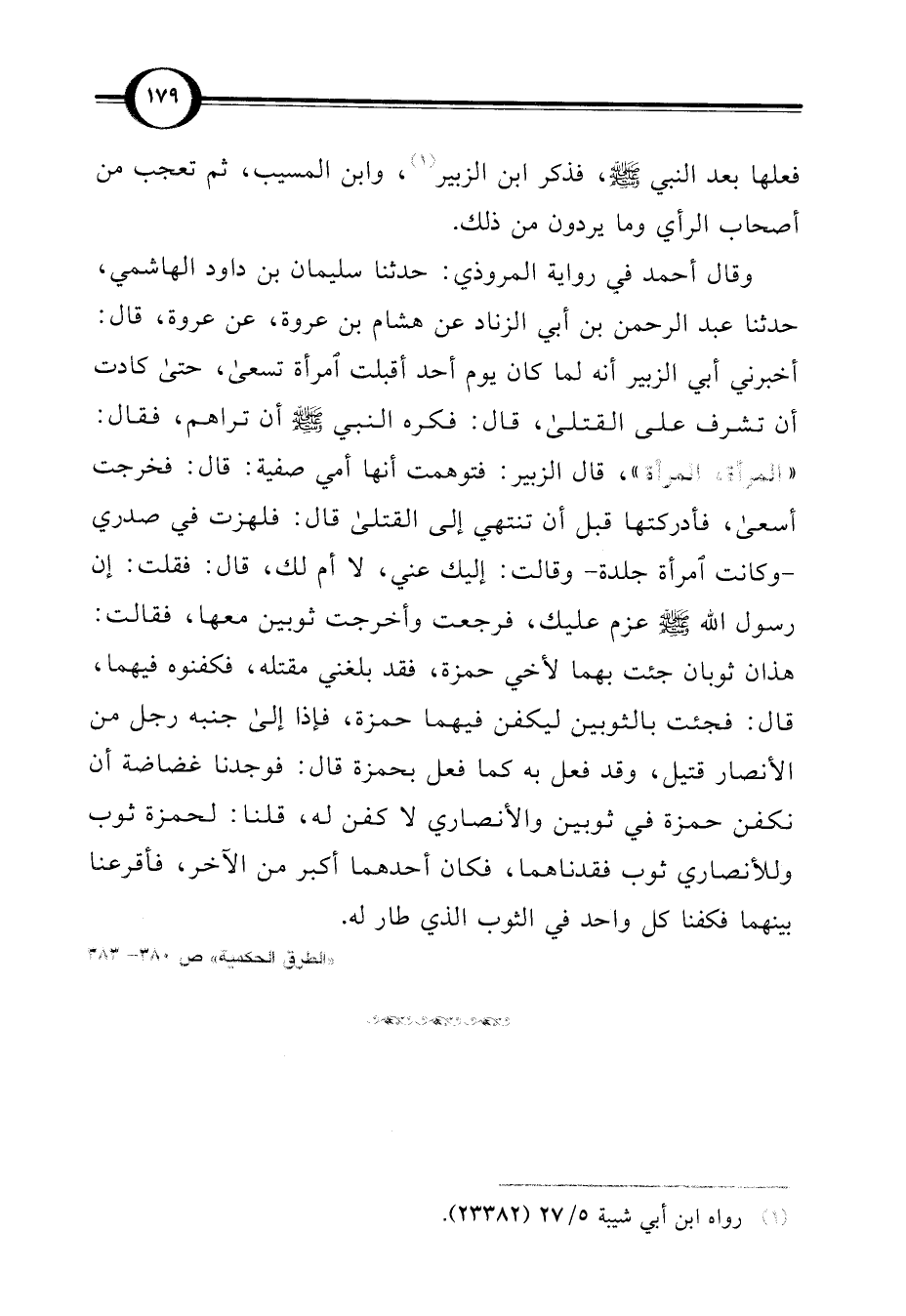 وقال أحمد في رواية المروذي: حدثنا سليمان بن داود الهاشمي، حدثنا عبد الرحمن بن أبي الزناد عن هشام بن عروة، عن عروة، قال: أخبرني أبي الزبير أنه لما كان يوم أحد أقبلت امرأة تسعى، حتى كادت أن تشرف على القتلى، قال: فكره النبي -صلى اللَّه عليه وسلم- أن تراهم، فقال: "المرأة، المرأة"، قال الزبير: فتوهمت أنها أمي صفية: قال: فخرجت أسعى، فأدركتها قبل أن تنتهي إلى القتلى قال: فلهزت في صدري -وكانت امرأة جلدة- وقالت: إليك عني، لا أم لك، قال: فقلت: إن رسول اللَّه -صلى اللَّه عليه وسلم- عزم عليك، فوجعت وأخرجت ثوبين معها، فقالت: هذان ثوبان جئت بهما لأخي حمزة، فقد بلغني مقتله، فكفنوه فيهما، قال: فجئت بالثوبين ليكفن فيهما حمزة، فإذا إلى جنبه رجل من الأنصار قتيل، وقد فعل به كما فعل بحمزة قال: فوجدنا غضاضة أن نكفن حمزة في ثوبين والأنصاري لا كفن له، قلنا: لحمزة ثوب وللأنصاري ثوب فقدناهما، فكان أحدهما أكبر من الآخر، فأقرعنا بينهما فكفنا كل واحد في الثوب الذي طار له.