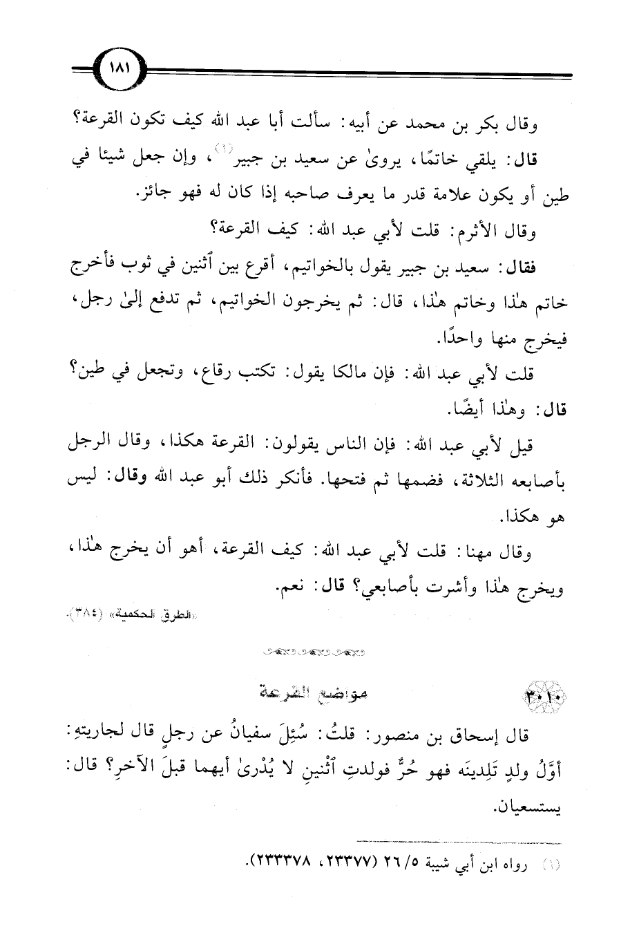 قيل لأبي عبد اللَّه: فإن الناس يقولون: القرعة هكذا، وقال الرجل بأصابعه الثلاثة، فضمها ثم فتحها. فأنكر ذلك أبو عبد اللَّه وقال: ليس هو هكذا.