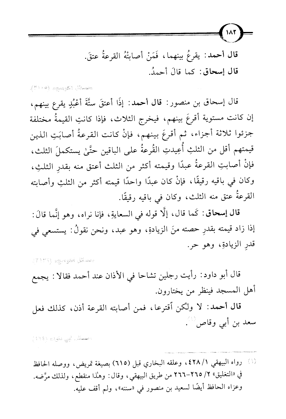 قال إسحاق بن منصور: قال أحمد: إذَا أعتقَ ستَّةَ أعْبُدٍ يقرع بينهم، إن كانت مستوية أقرعَ بينهم، فيخرج الثلاث، فإذا كانتِ القيمةُ مختلفة جزئوا ثلاثة أجزاء، ثم أقرعَ بينهم، فإنْ كانت القرعةُ أصابَتِ الذين قيمتهم أقل من الثلثِ أُعِيدتِ القُرعةُ على الباقين حتَّى يستكملَ الثلث، فإنْ أصابتِ القرعةُ عبدًا وقيمته أكثر من الثلث أعتق منه بقدرِ الثلثِ، وكان في باقيه رقيقًا، فإنْ كان عبدًا واحدًا قيمته أكثر من الثلثِ وأصابته القرعةُ عتق منه الثلث، وكان في باقيه رقيقًا.