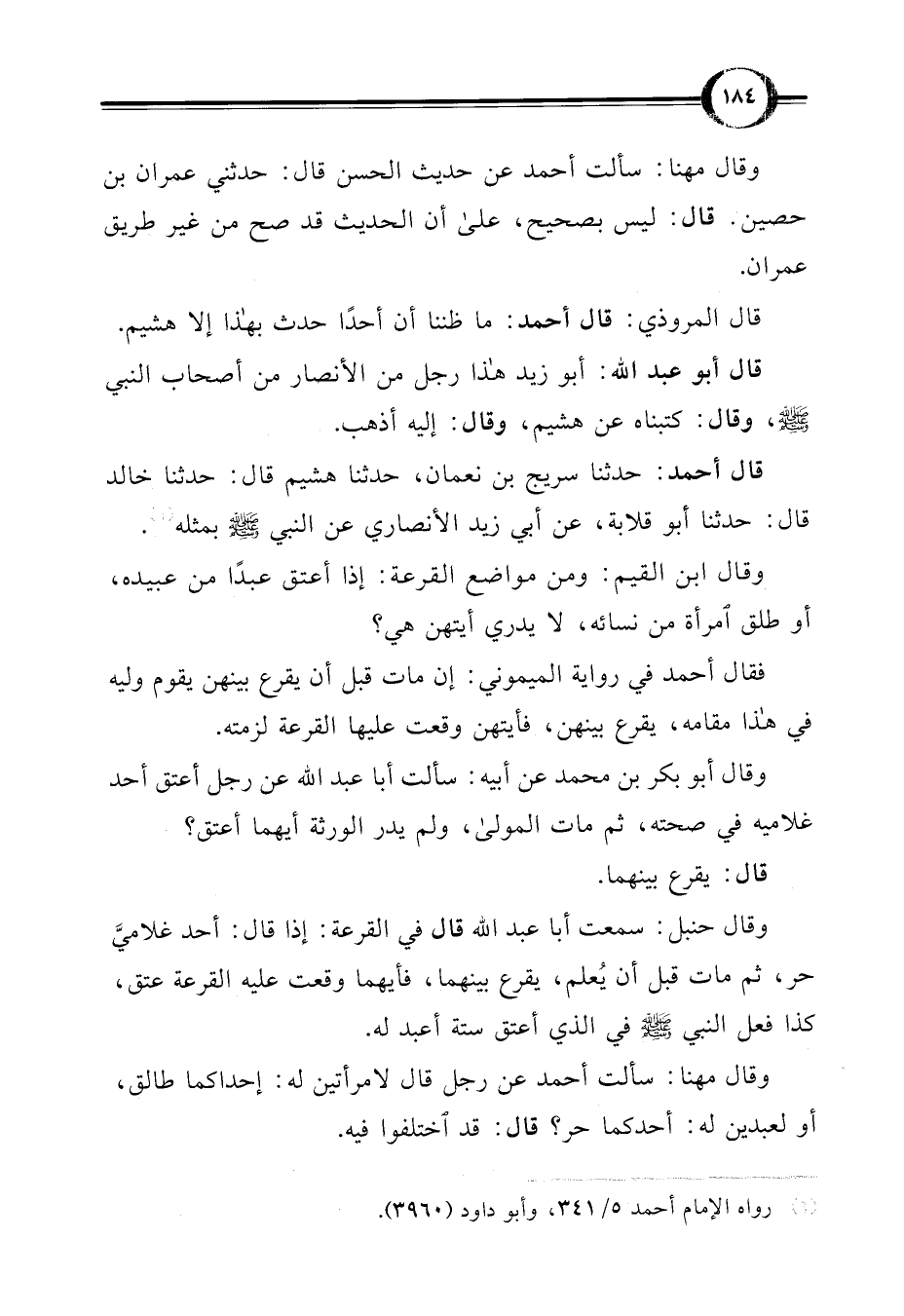 وقال حنبل: سمعت أبا عبد اللَّه قال في القرعة: إذا قال: أحد غلاميَّ حر، ثم مات قبل أن يُعلم، يقرع بينهما، فأيهما وقعت عليه القرعة عتق، كذا فعل النبي -صلى اللَّه عليه وسلم- في الذي أعتق ستة أعبد له.