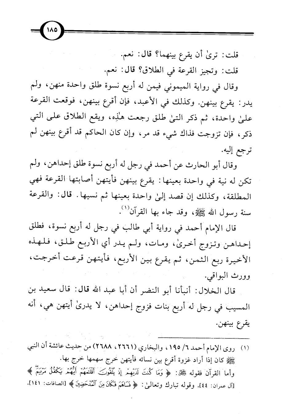 وقال أبو الحارث عن أحمد في رجل له أربع نسوة طلق إحداهن، ولم تكن له نية في واحدة بعينها: يقرع بينهن فأيتهن أصابتها القرعة فهي المطلقة، وكذلك إن قصد إلى واحدة بعينها ثم نسيها. قال: والقرعة سنة رسول اللَّه -صلى اللَّه عليه وسلم-، وقد جاء بها القرآن (¬1).